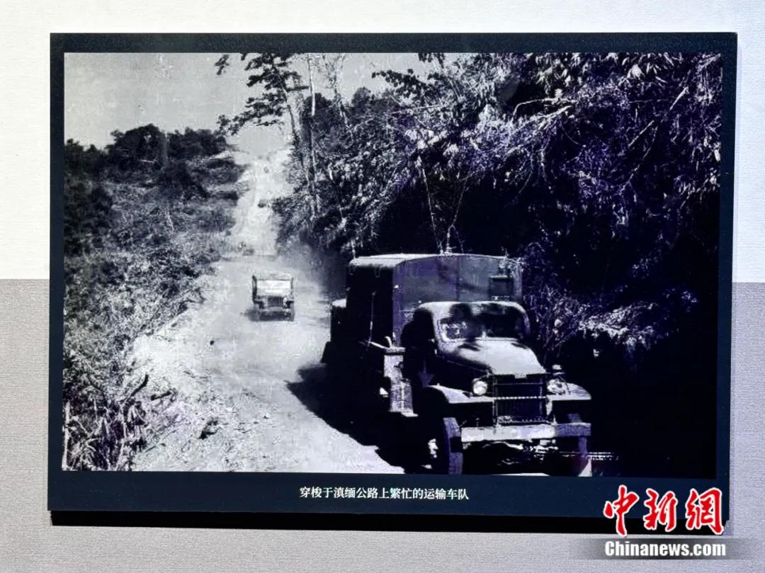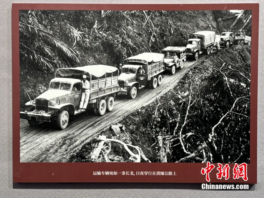 图为穿梭于滇缅公路上繁忙的运输车队,“血肉筑就抗战生命线——抗战时期滇缅公路档案文献图片展”展出内容。