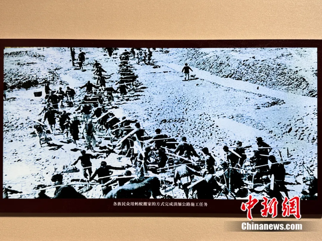 图为各族民众用蚂蚁搬家的方式完成滇缅公路施工任务,“血肉筑就抗战生命线——抗战时期滇缅公路档案文献图片展”展出内容。