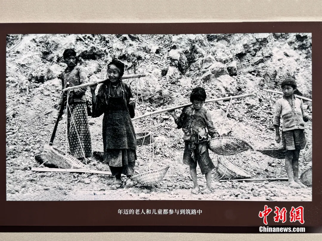 图为老人和儿童都参与修筑滇缅公路,“血肉筑就抗战生命线——抗战时期滇缅公路档案文献图片展”展出内容。