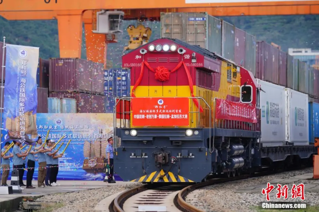 图为7月4日,“郑和号”海公铁国际多式联运班列在云南昆明首发,标志着中国西南连接印度洋的新国际物流通道贯通。中新社记者刘冉阳摄
