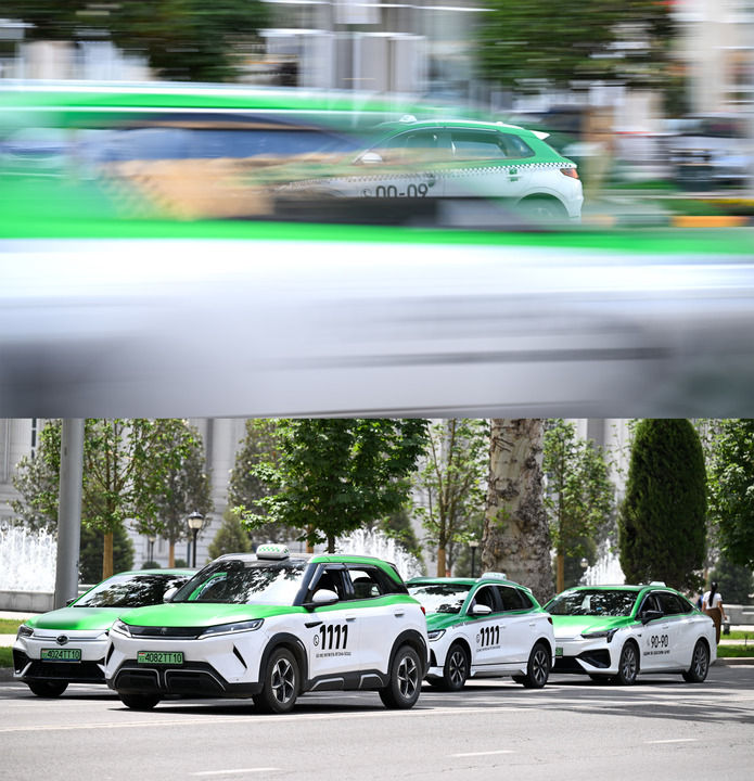 在塔吉克斯坦首都杜尚别,中国新能源汽车行驶在道路上(拼版照片,上图摄于2025年5月28日,下图摄于2025年5月29日)。新华社记者李任滋摄