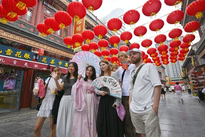 2025年8月14日,上合国家学生在天津古文化街留影。新华社记者李然摄