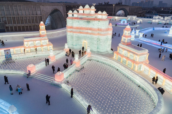 2023年2月1日,游客在哈尔滨冰雪大世界园区冰雪景观《胜利之城》周边游玩,该冰雪景观以印度的法塔赫布尔西格里城为原型设计建造(无人机照片)。此届哈尔滨冰雪大世界将上合组织成员国的特色建筑以冰雪景观的形式呈现。新华社记者谢剑飞摄