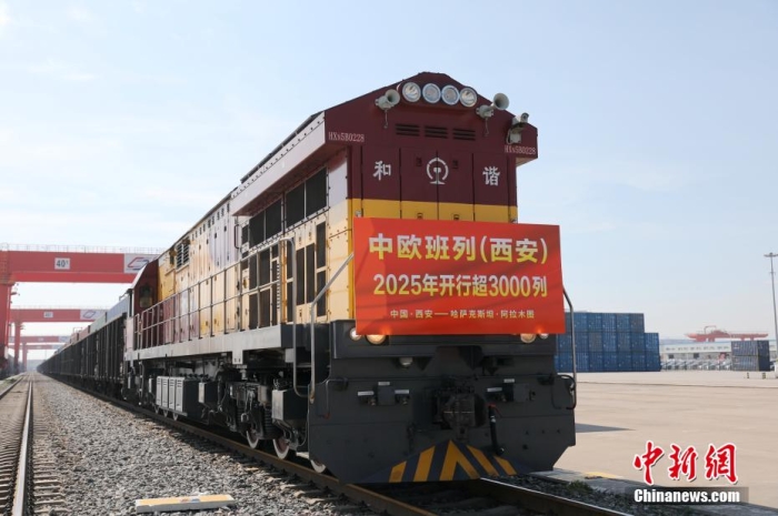 7月4日,满载日用百货、陶瓷制品等货品的中欧班列从西安驶向阿拉木图。 中新社记者 张远 摄