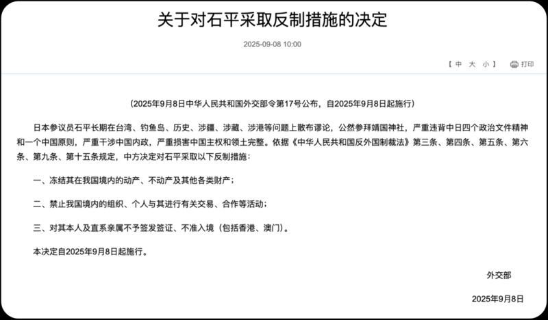 9月8日,中方宣布对日本参议员石平采取反制措施,禁止其进入中国境内,冻结其在华资产,并限制其与中国的商业往来。