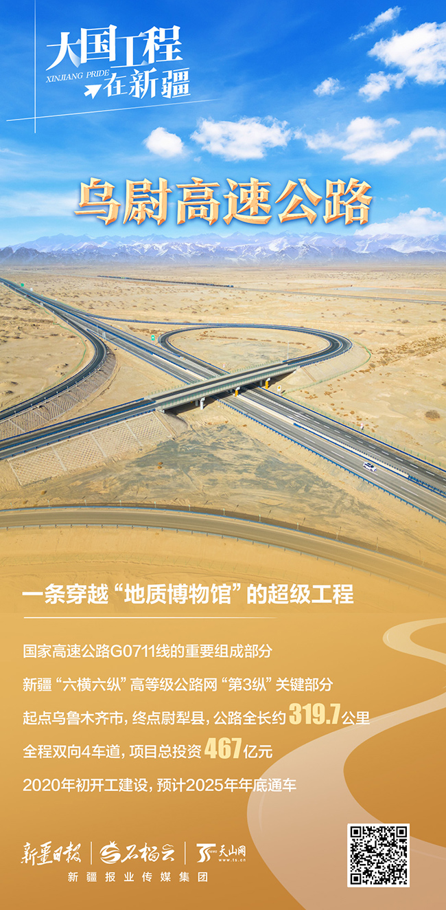 乌尉高速还是新疆“六横六纵”高等级公路网中“第3纵”,即“阿勒泰—乌鲁木齐—库尔勒—若羌”的重要组成部分。作为天山南北资源互通的大通道,它串联起“北疆城市带”和“南疆城市群”,实现准噶尔盆地与塔里木盆地高速(一级)环线的快速连接。