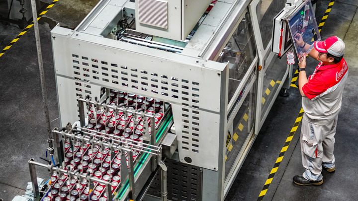 中粮可口可乐饮料(贵州)有限公司的工作人员在生产线旁进行操作(2025年8月24日摄)。新华社记者 陶亮 摄