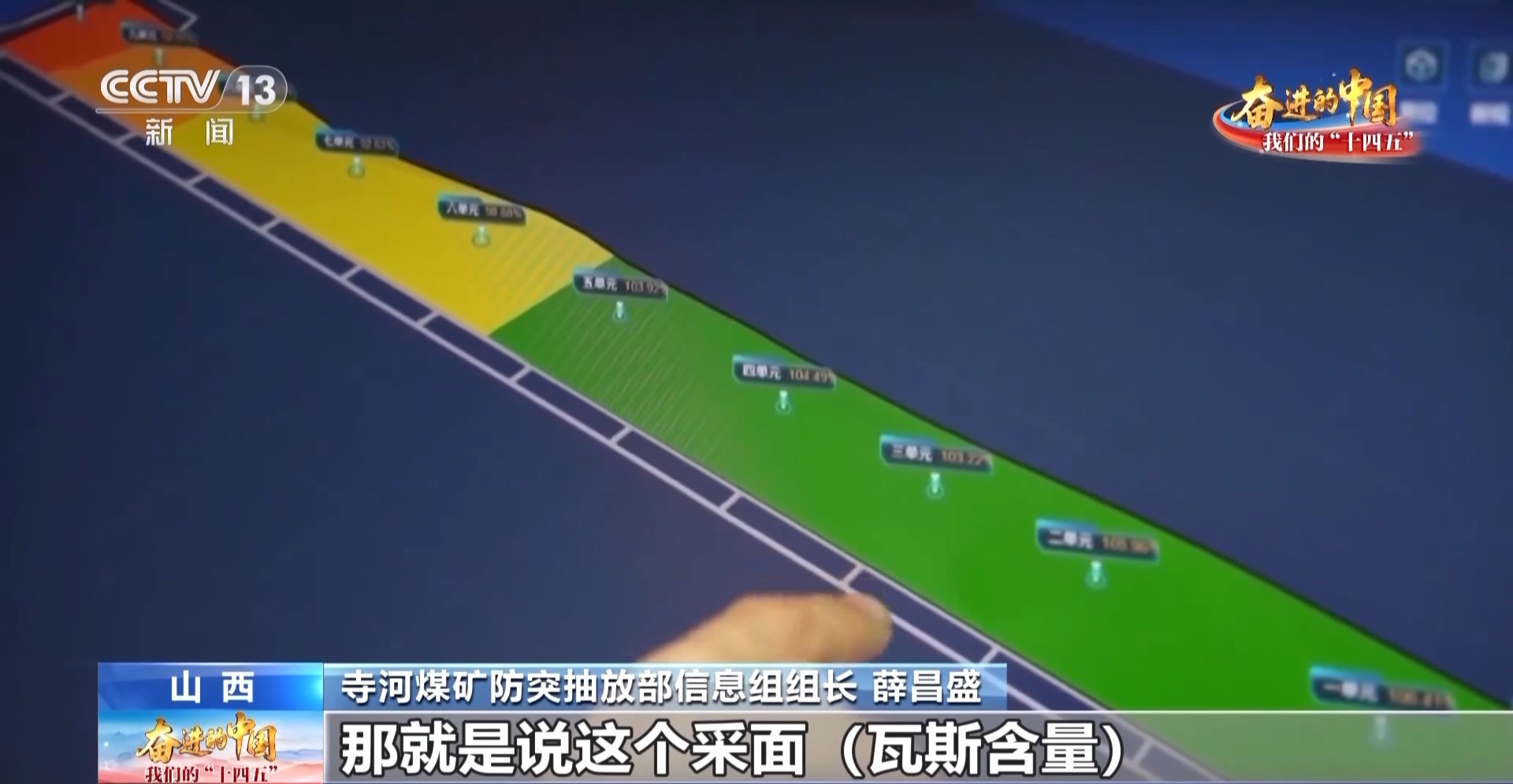 寺河煤矿防突抽放部信息组组长 薛昌盛:当一个采面整体变绿的时候,那就说明这个采面瓦斯含量整体是抽采达标的,以前需要派2~3个人进行现场实测,现在在电脑上实时进行监控。