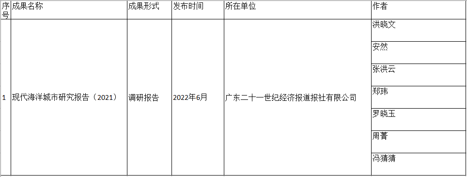根据广东省社科联《关于开展第十一届广东省哲学社会科学优秀成果奖评奖的通知》要求,广东二十一世纪经济报道报社有限公司拟申报“现代海洋城市研究报告(2021)”1项成果,现予以公示。公示期由2025年9月16日至9月22日,公示期间若有异议请向广东二十一世纪经济报道报社有限公司实名反映,电话:020-87399755。