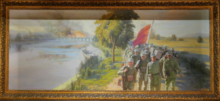 “随着一声震天巨响,爆破终于成功,大铁桥架坠落到桥墩下边去了。津浦铁路彻底中断,敌军的运输命脉被斩断。战后,我爷爷被授予‘爆破勇士’的光荣称号。”朱晓清说。 展示运河支队爆破运河大桥的油画《凯旋》