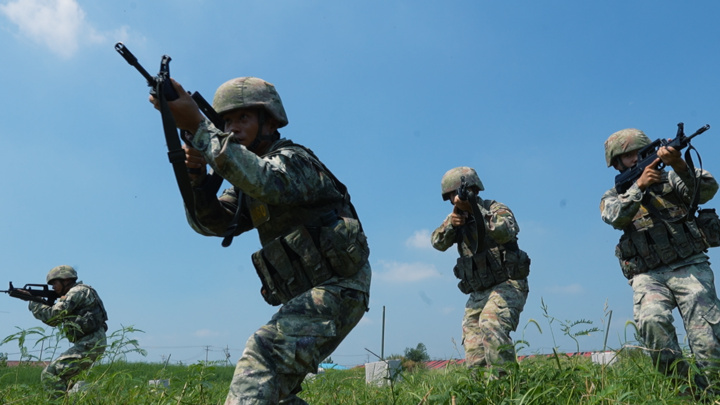 烈日灼人,汗水混杂着泥土粘在作训服上。但战士们一丝不苟,目光如炬,动作凌厉,搜索、突击、越障、匍匐……一举一动彰显着人民军队的凛然军威与中国军人的过硬本领。