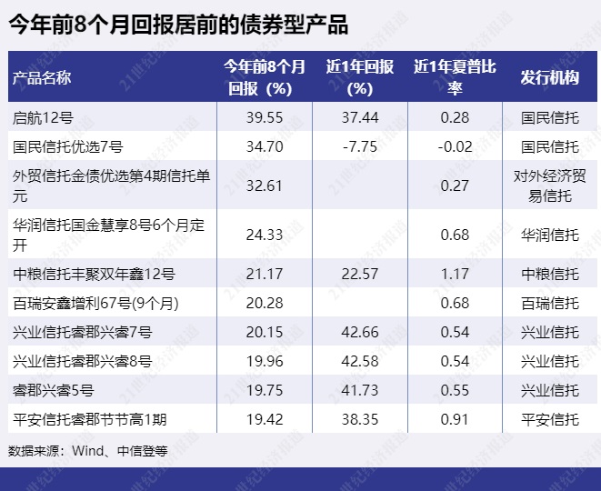 具体产品而言,今年前8个月有3只债券型信托产品回报超过30%,包括国民信托的“启航12号”和“国民信托优选7号”,以及“外贸信托金债优选第4期信托单元”。