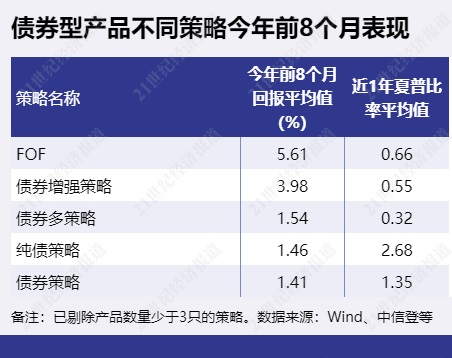 纯债型产品在今年前8个月债市震荡的情况下显然很难取得如此高收益,推测回报居前产品大多采取了收益增强策略,即在主要投资债券等固收收益类资产的基础上,适当投资权益类资产等其他类型资产,以达到增厚收益的目的。