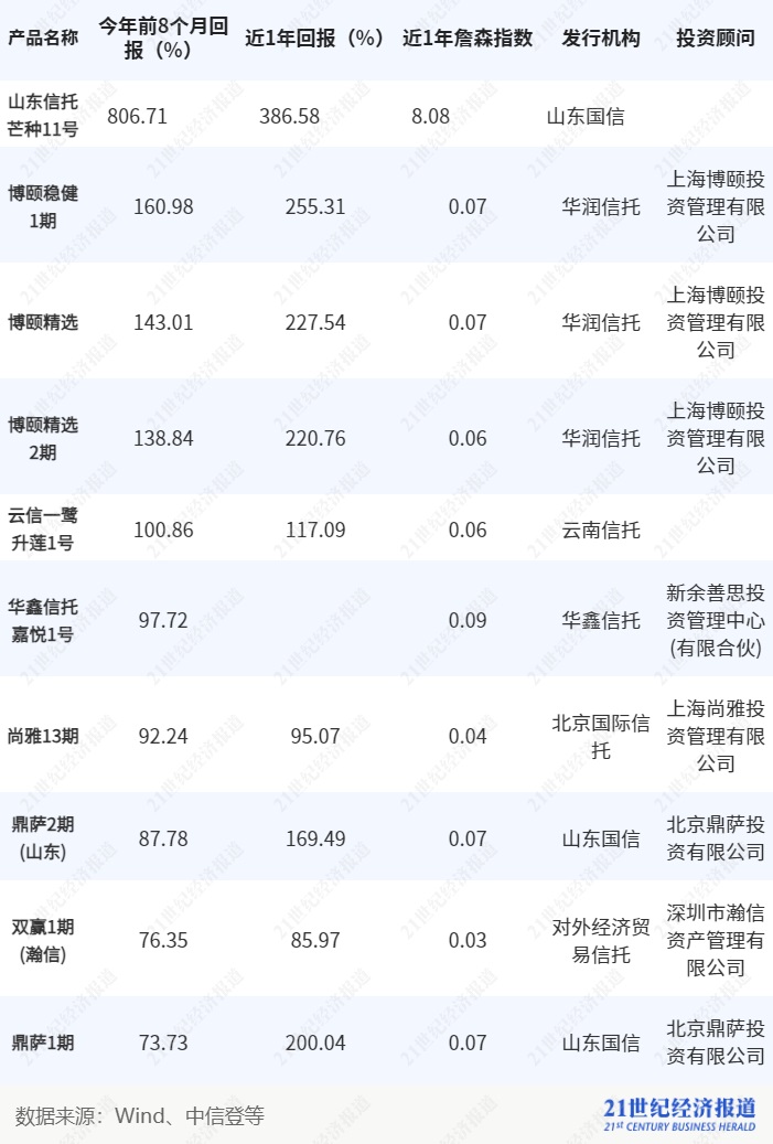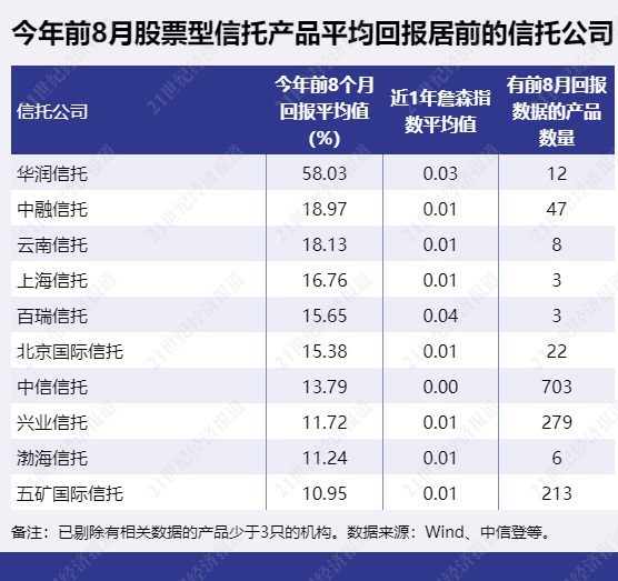 不少股票型信托产品为阳光私募,由私募机构等担任投资顾问实际操盘。若以投资顾问统计,今年前8个月股票型产品平均回报最高的是上海博颐投资管理有限公司,3只产品今年前8个月回报超100%。