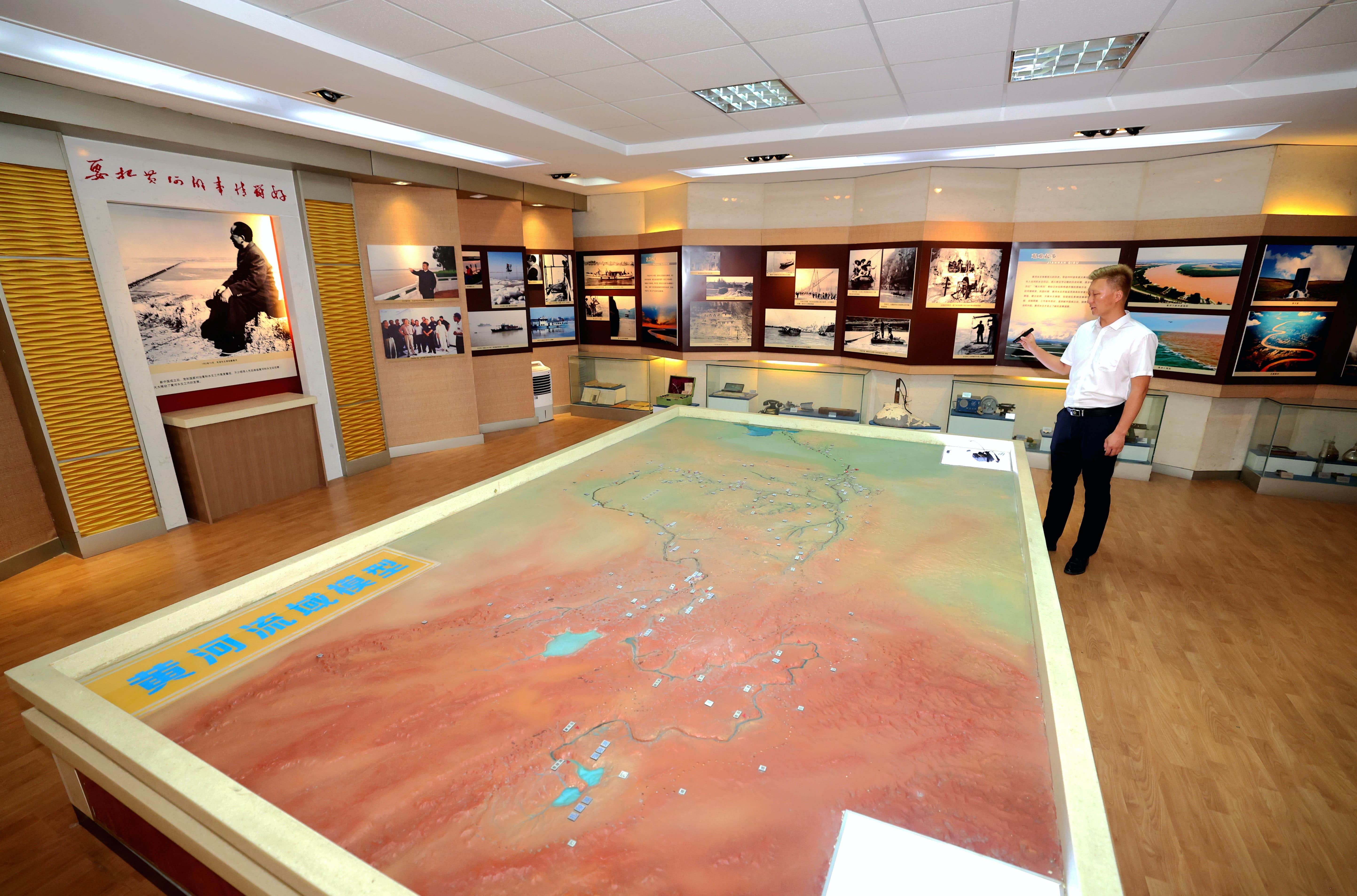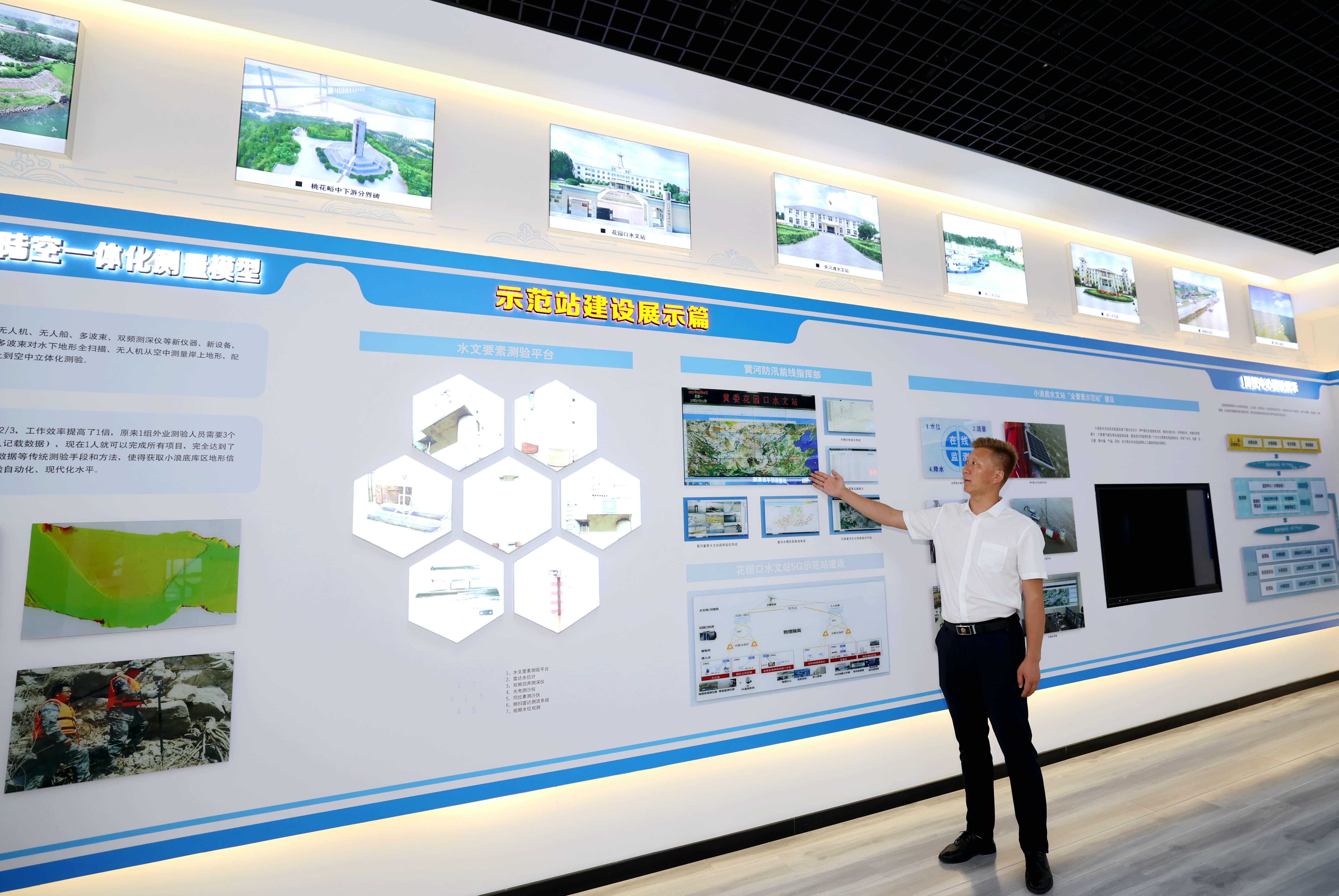 花园口水文站刘站长在黄河水文展厅介绍情况。