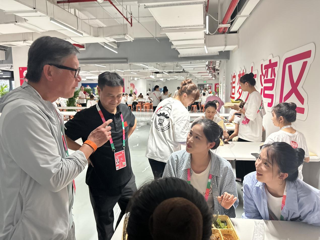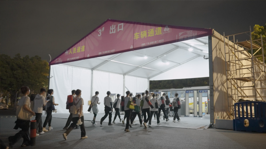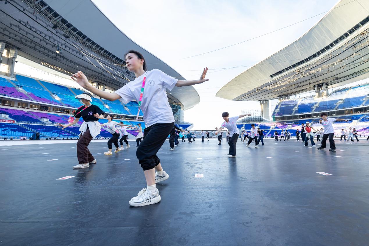 当日下午,数百名演员精神饱满、列队有序进入场馆,迅速投入场内排练。他们当中八成来自粤港澳大湾区多所高校。从下午3时至深夜11时30分,演员们聚焦于文体表演的分篇章内容,反复调整队形走位,与场地、音乐等进行多维协同。