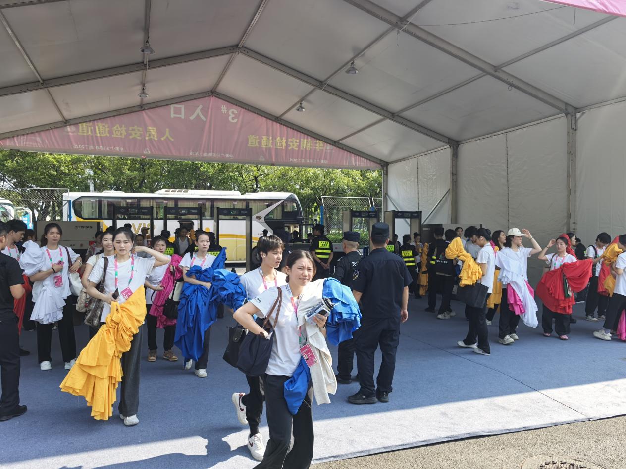 交通团队通过科学调度实现大规模高效通行,首班车于下午3时抵达场馆,末班车直至2日凌晨0时25分将最后一批演员安全送回学校;安检环节通过优化流程,仅用5分钟即完成几十名演员的快速入场。