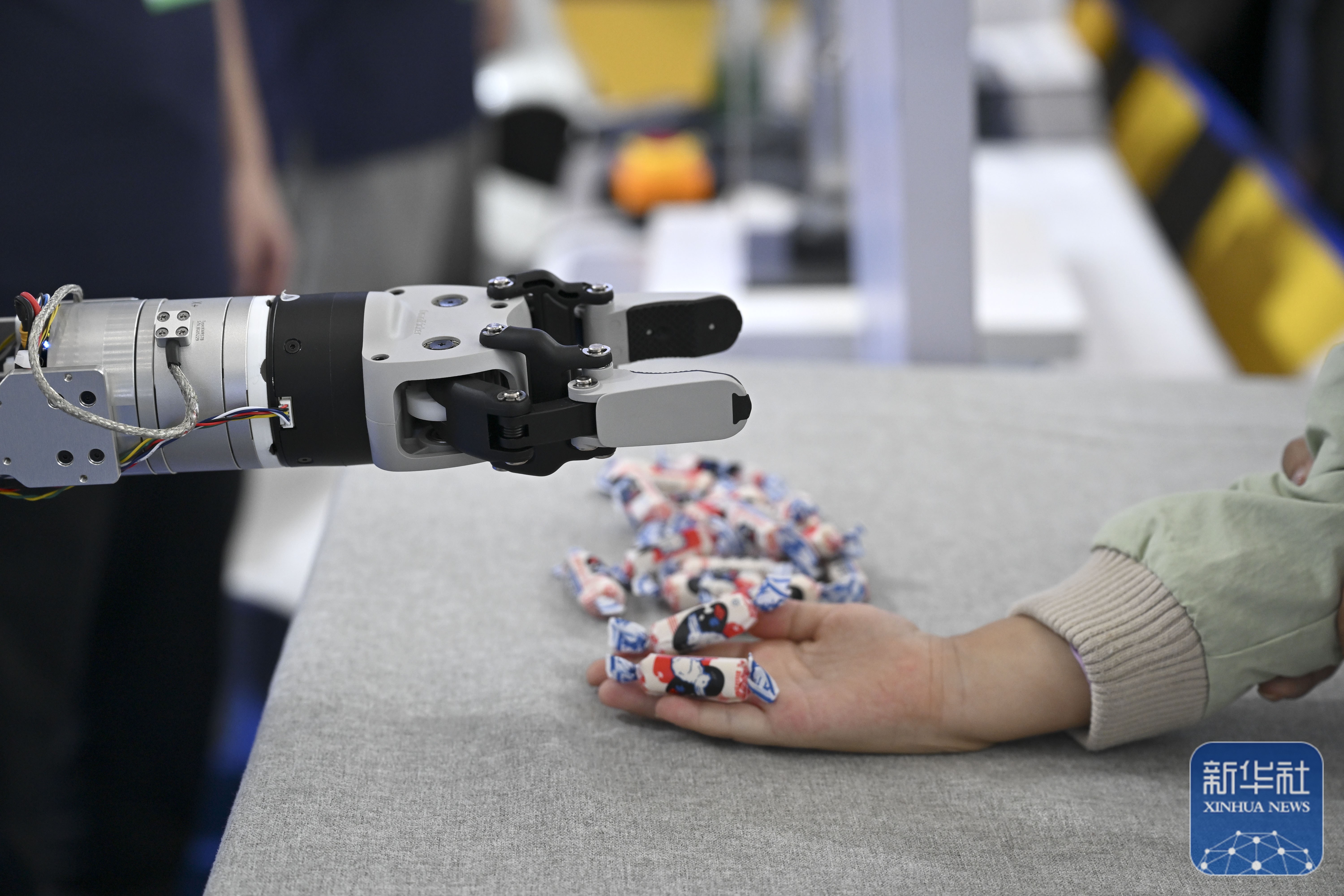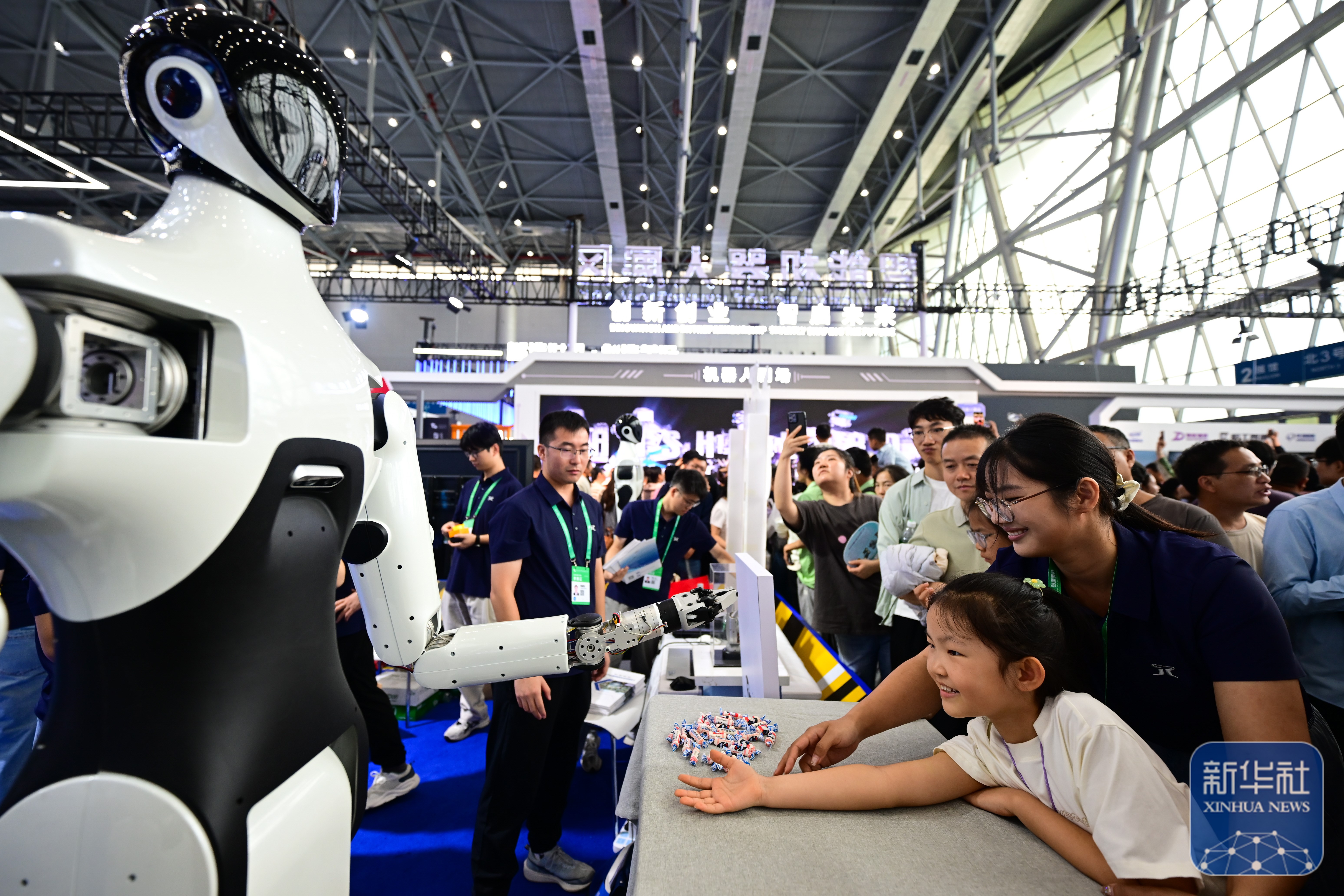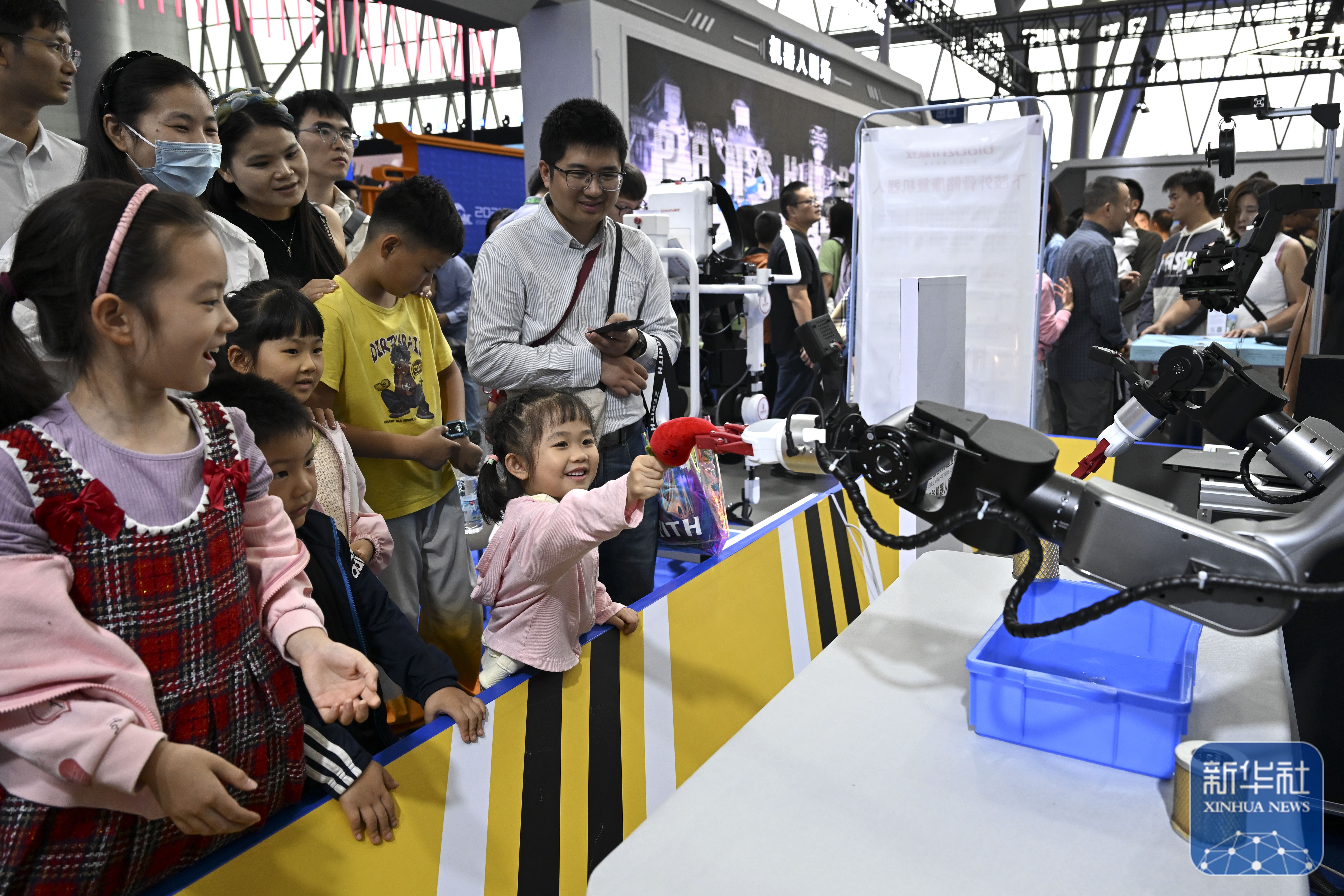 ↑ 9月20日,在2025世界制造业大会上,机器人抓取糖果放到小朋友手上。新华社记者 黄博涵 摄