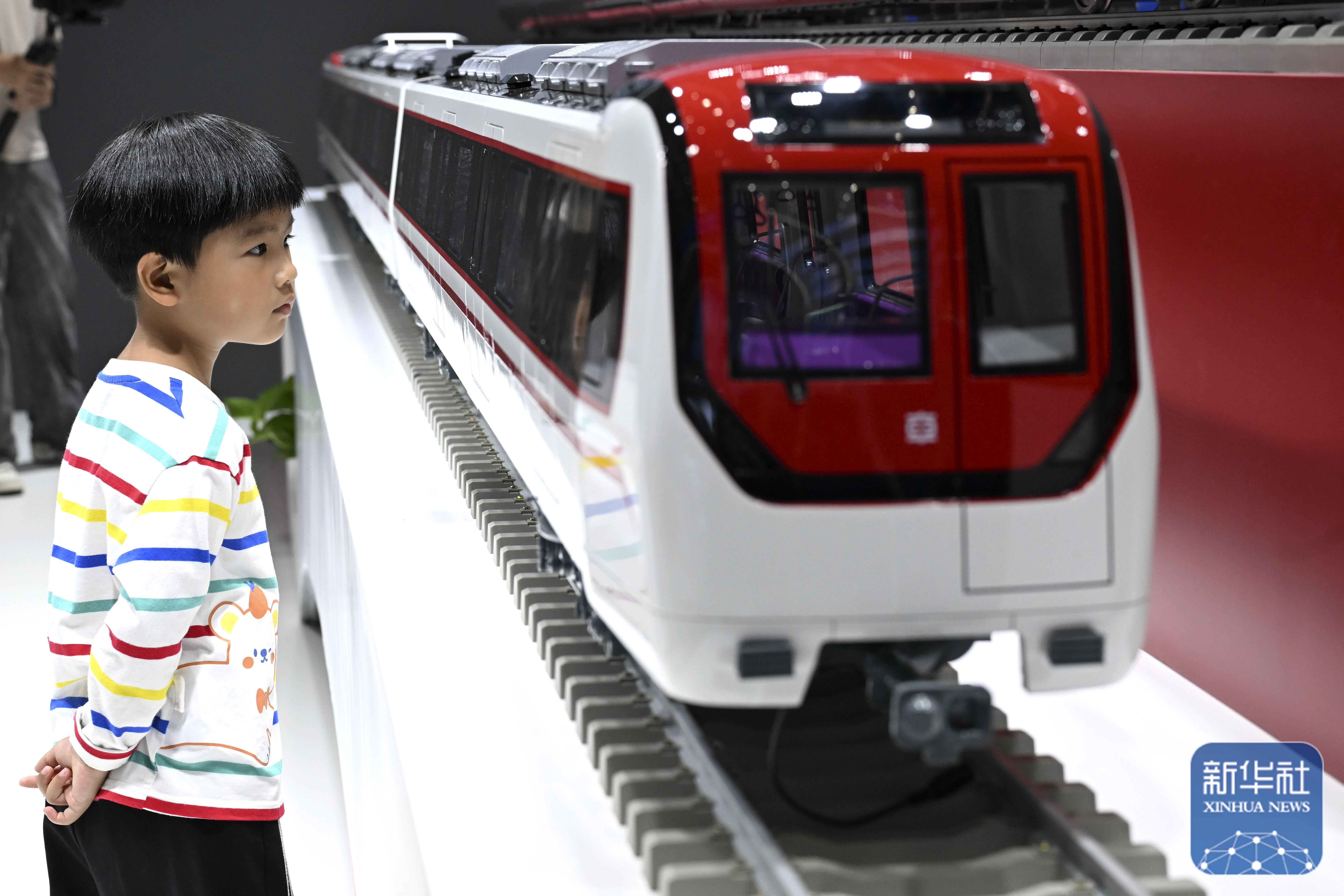 ↑ 9月20日,小朋友在2025世界制造业大会上观看一款地铁模型。新华社记者 黄博涵 摄