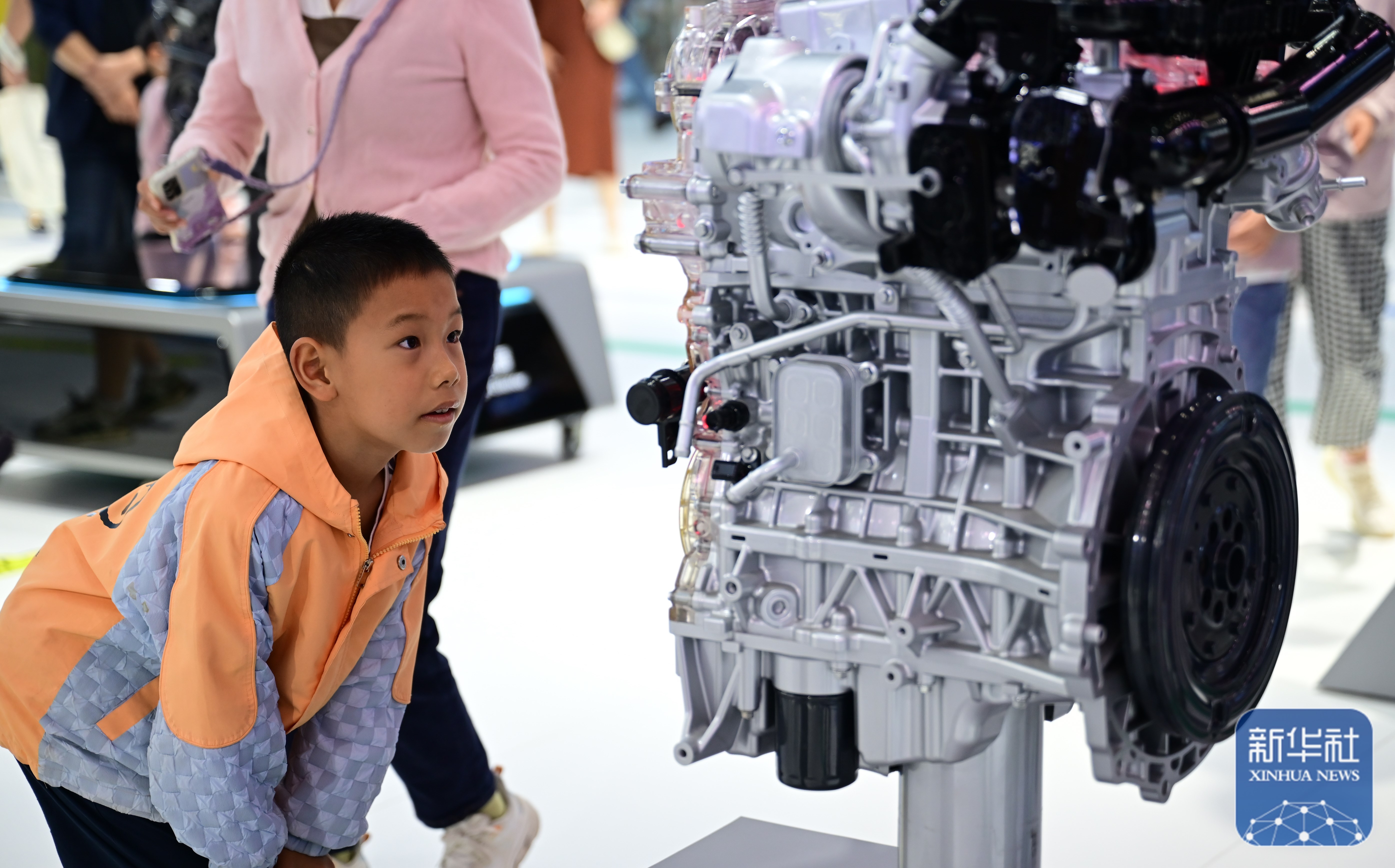 ↑ 9月20日,小朋友在2025世界制造业大会上观看一款发动机。新华社记者 周牧 摄