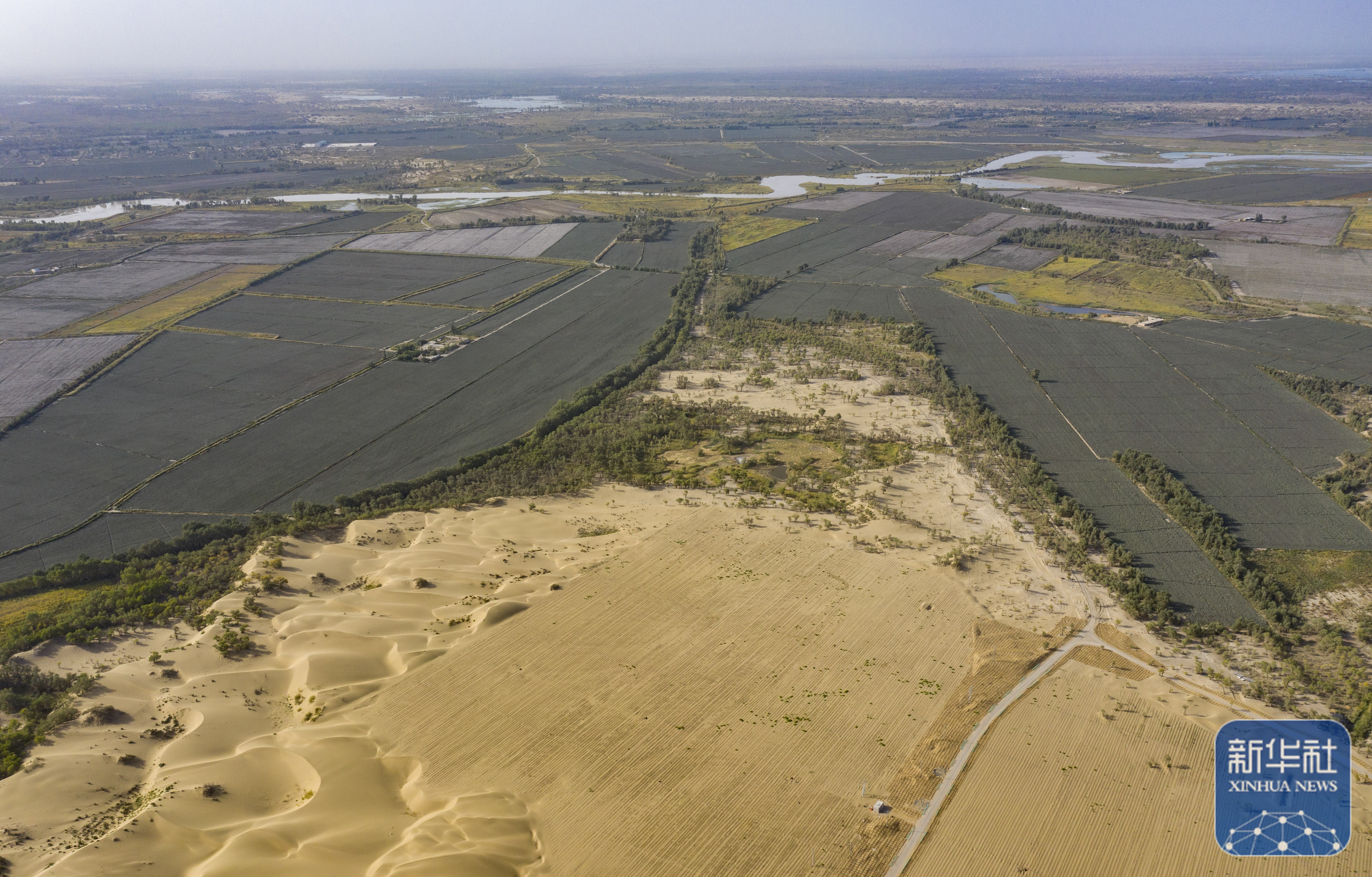 ↑ 在新疆尉犁县境内的塔里木河南岸防沙治沙区拍摄的罗布麻种植区(右下)、治理之前自然形成的沙丘(左下)、塔里木河及周围绿洲(上)(无人机照片,9月20日摄)。新华社记者 陈朔 摄