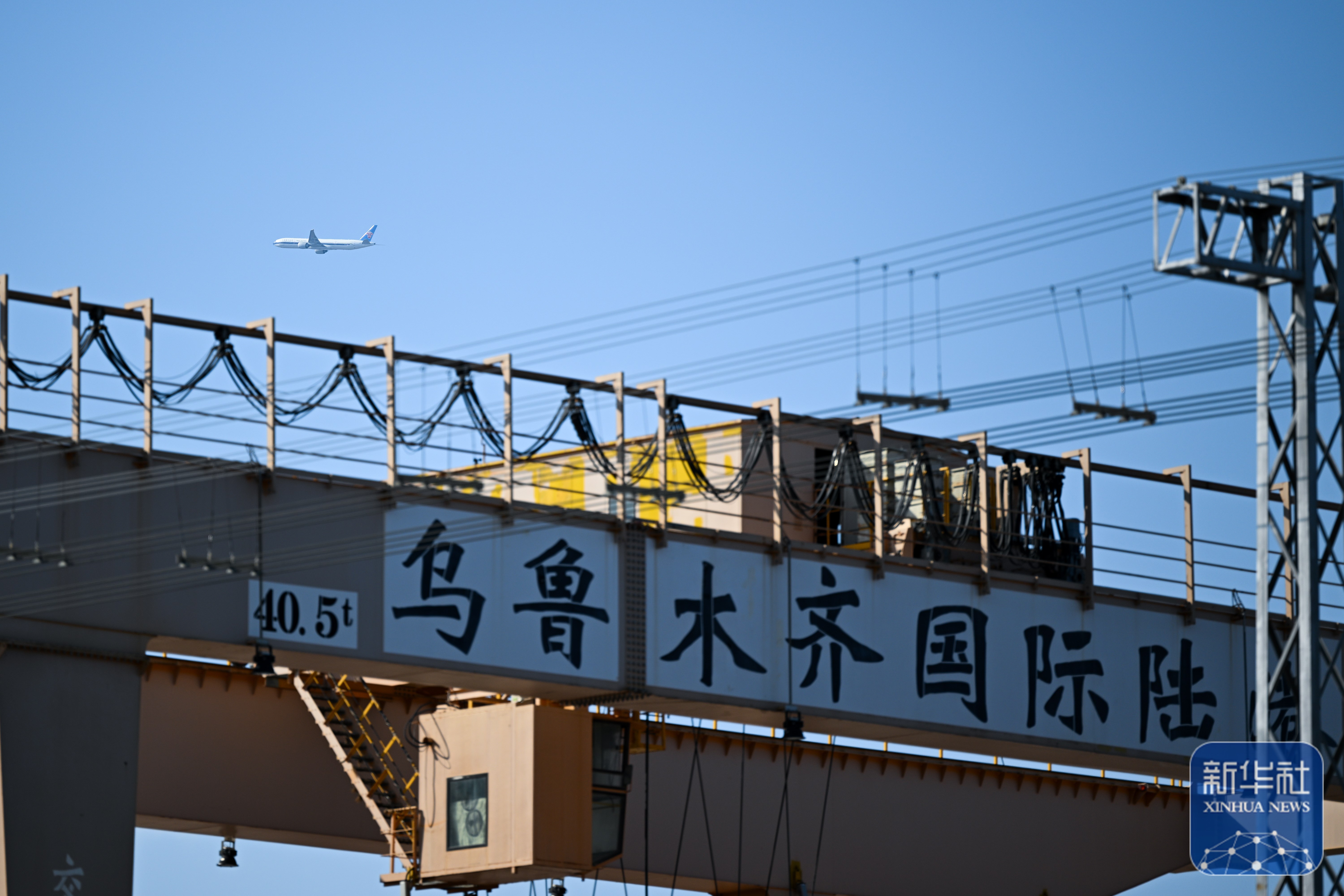 ↑9月15日,一架飞机从乌鲁木齐国际陆港区上空飞过。新华社记者 辛悦卫 摄