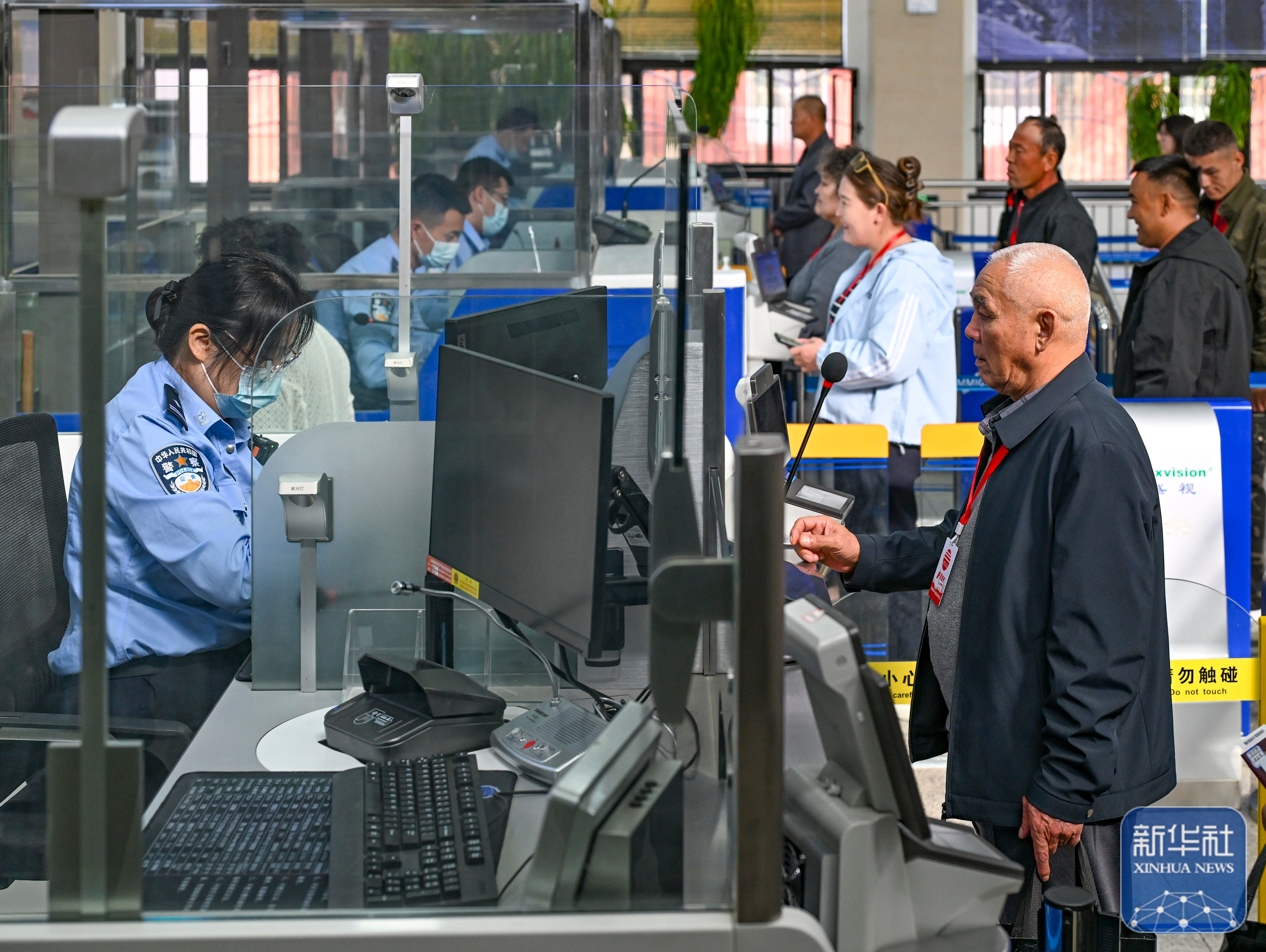 ↑9月17日,巴克图出入境边防检查站的移民管理警察在为来自哈萨克斯坦的旅客办理入境手续。新华社记者 王菲 摄