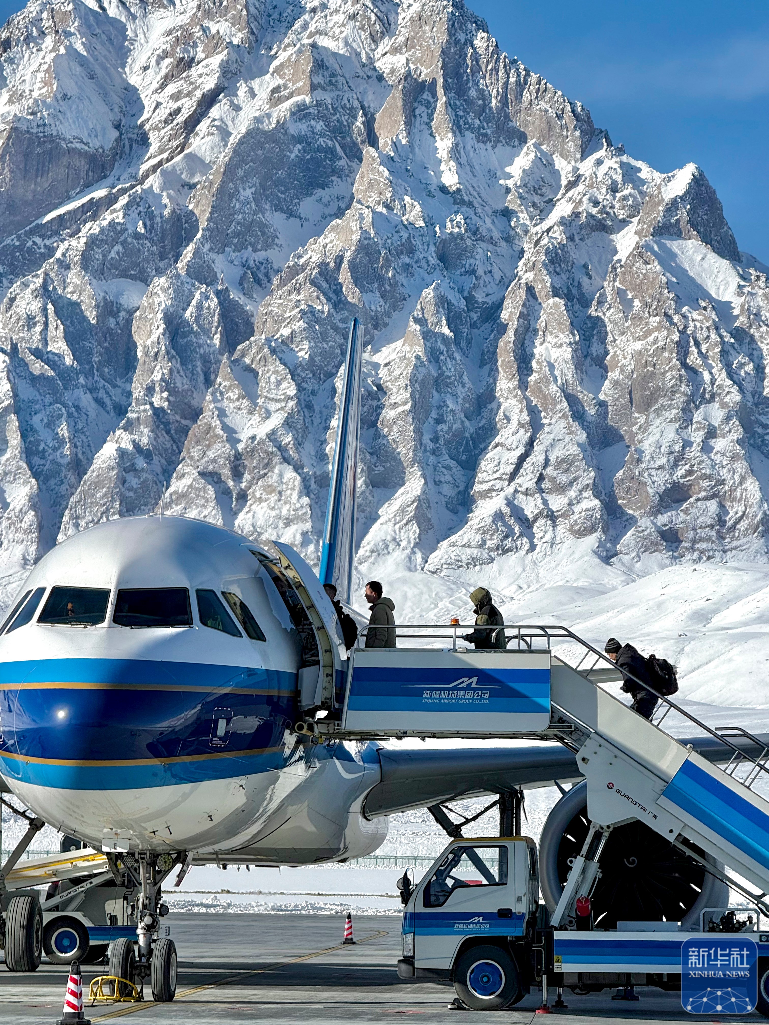 ↑1月13日,旅客在塔什库尔干红其拉甫机场准备登机。新华社记者 陈朔 摄