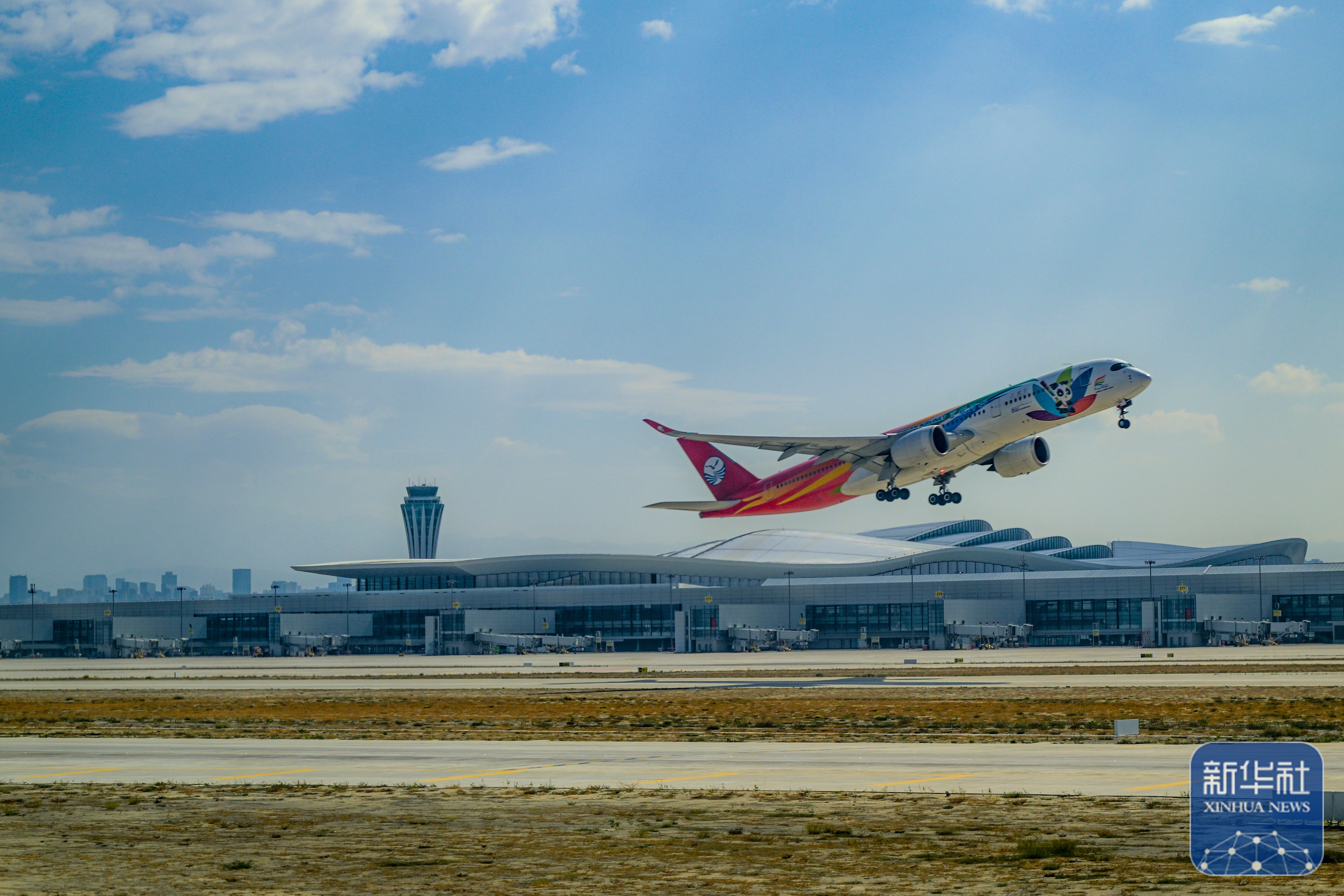 ↑9月15日,一架飞机从乌鲁木齐天山国际机场起飞。新华社记者 陈朔 摄