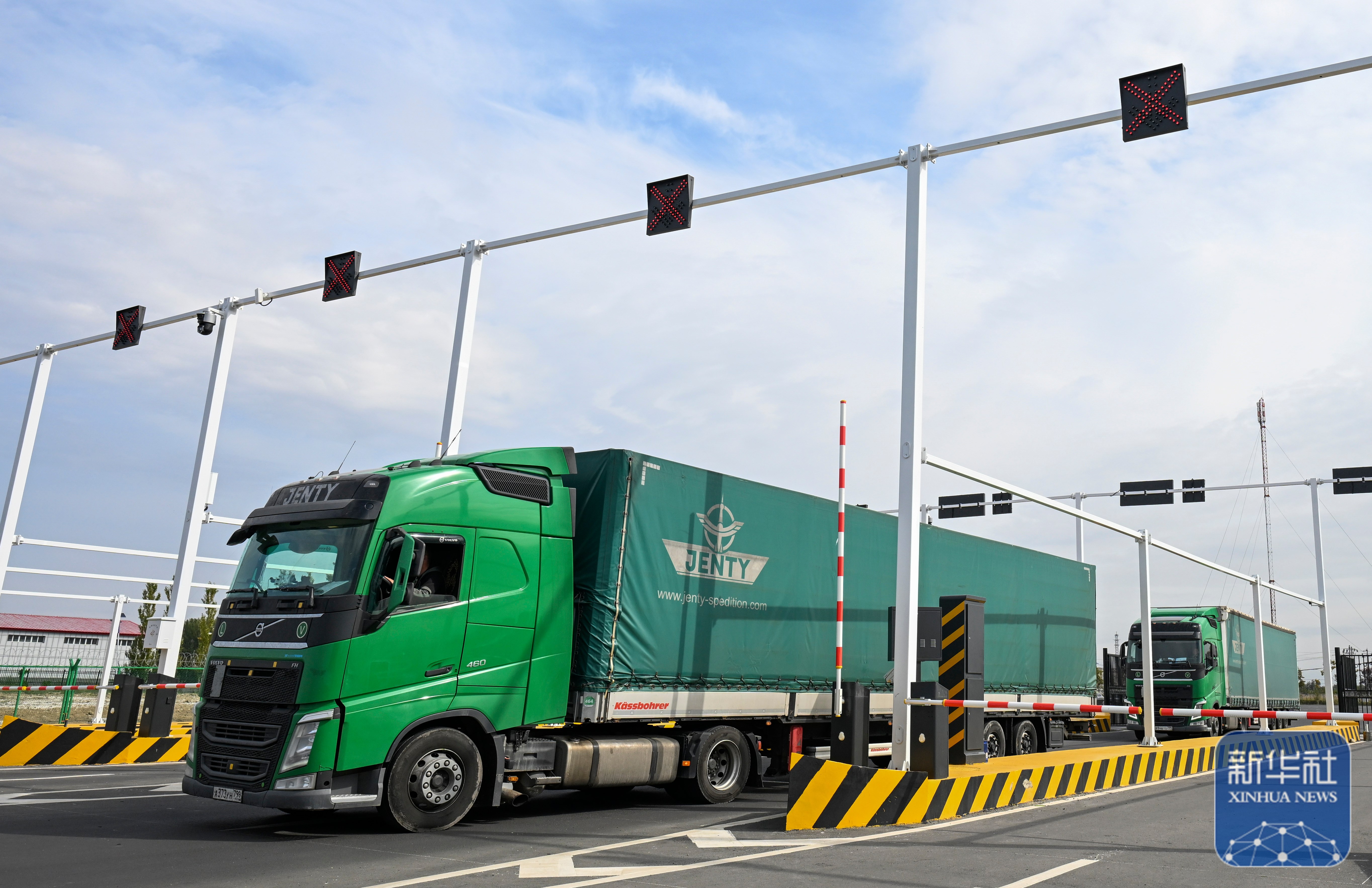 ↑9月17日,来自俄罗斯的货车从位于新疆塔城地区的巴克图口岸海关集中查验场地出关。新华社记者 辛悦卫 摄