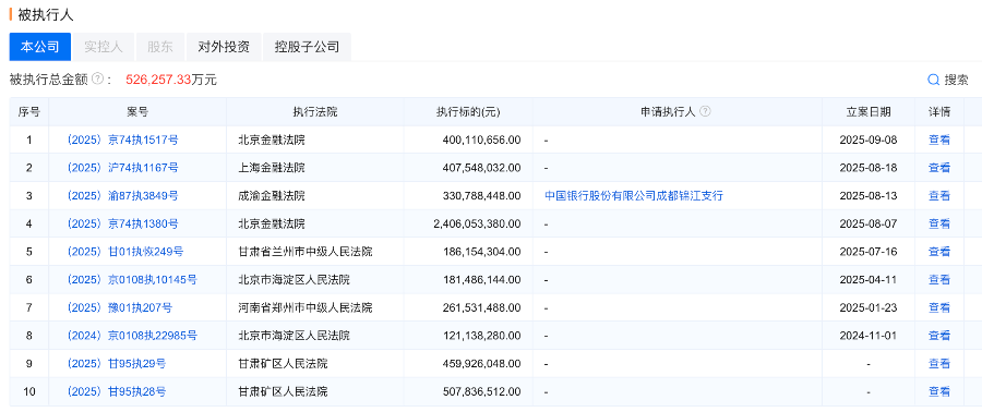 从申请执行人来看,出现了多家金融机构的身影。例如,中国银行成都锦江支行作为申请执行人,申请执行金额达3.3亿元;而在上海金融法院审理的4.07亿元案件中,原告则为上海国际信托有限公司。