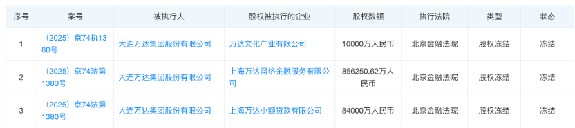 北京金融法院出具的执行信息显示,目前万达集团持有的上海万达网络金融服务有限公司85.62亿元股权、上海万达小额贷款有限公司8.4亿元股权均处于冻结状态。