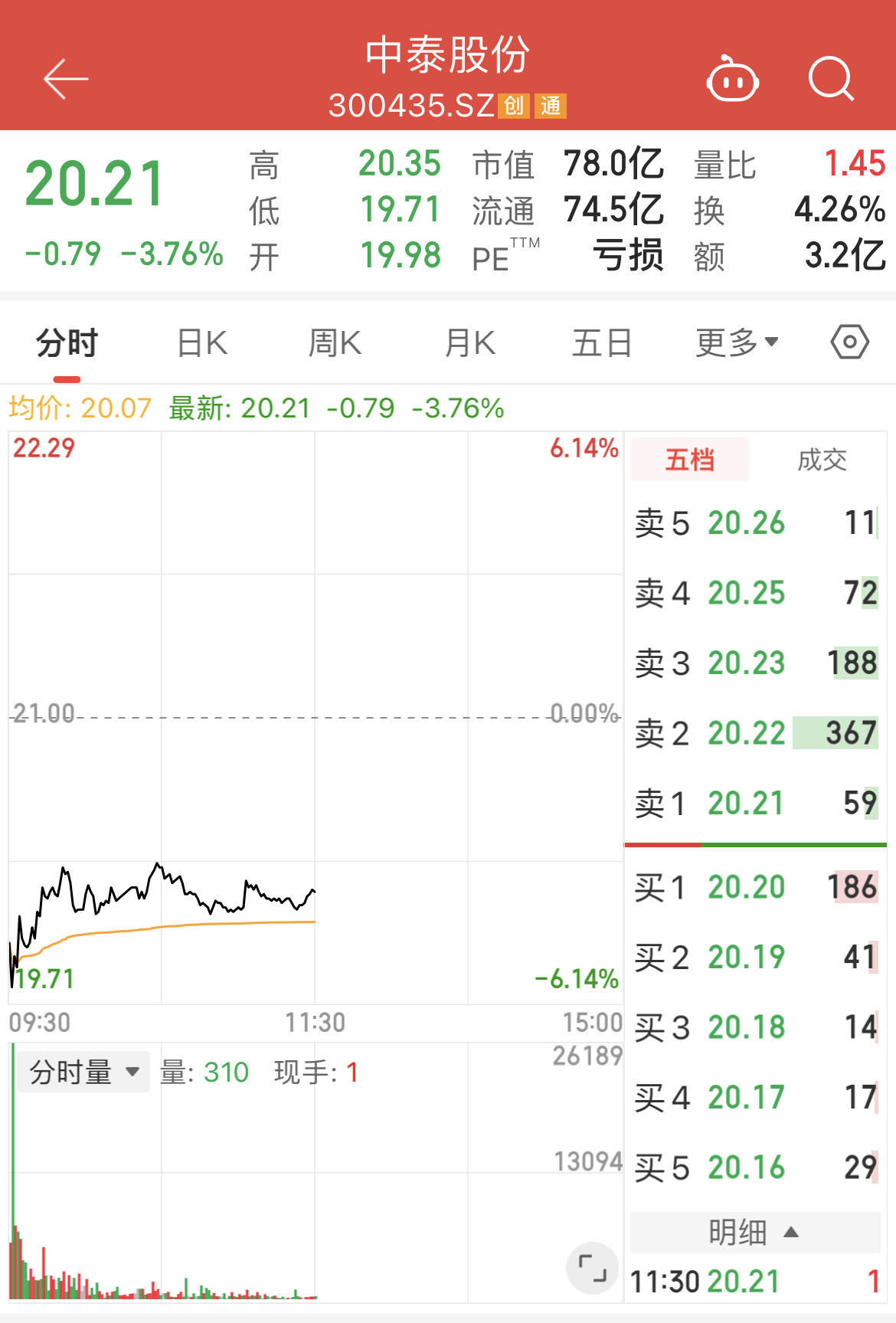 9月29日,中泰股份开盘跳水,盘中一度跌超6%,截至午盘,跌幅收窄至3.76%,报20.21元/股。