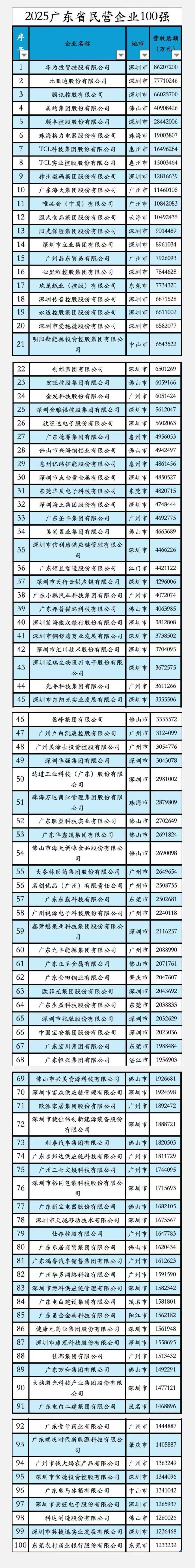2025广东省民营企业100强发布,华为、比亚迪、腾讯排前三