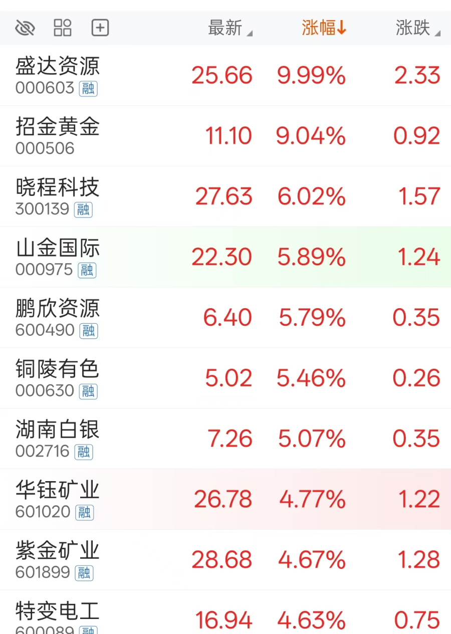 贵金属板块午后拉升。截至13:08,盛达资源涨停,招金黄金触及涨停,晓程科技、山金国际、鹏欣资源等跟涨,兴业银锡、紫金矿业盘中续创历史新高。