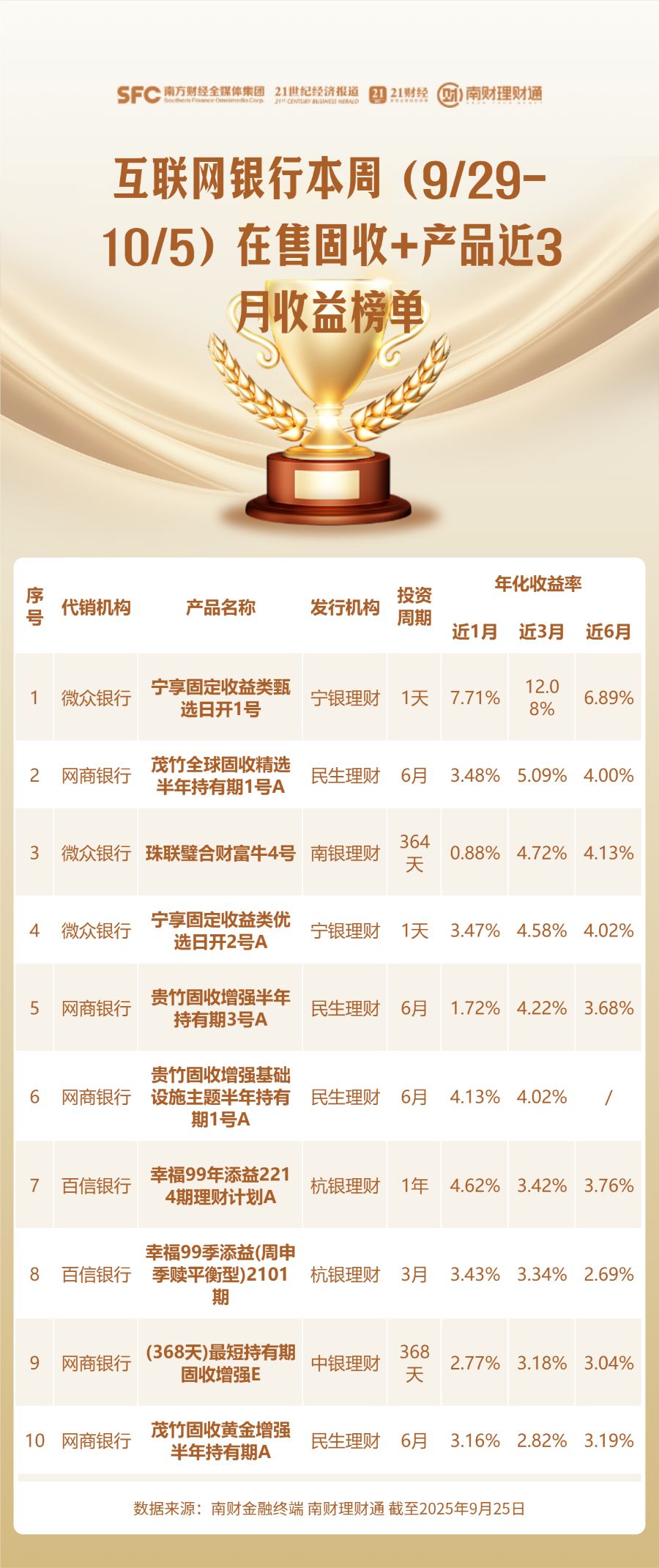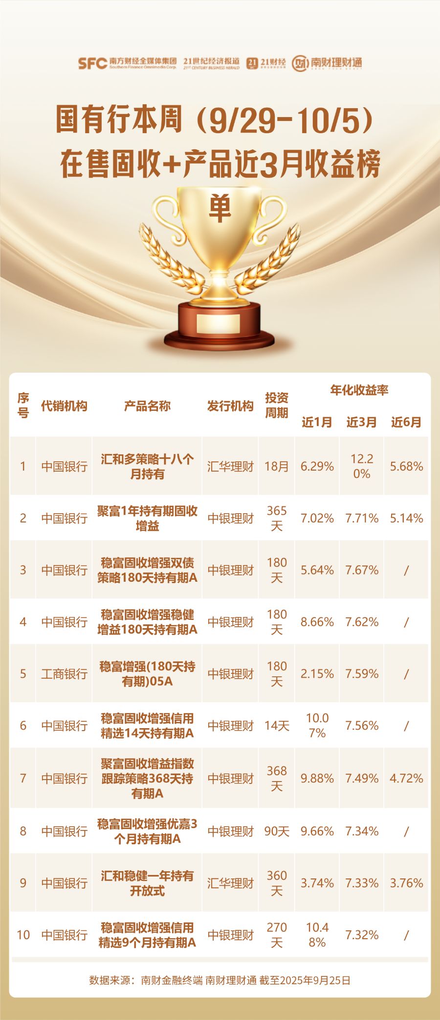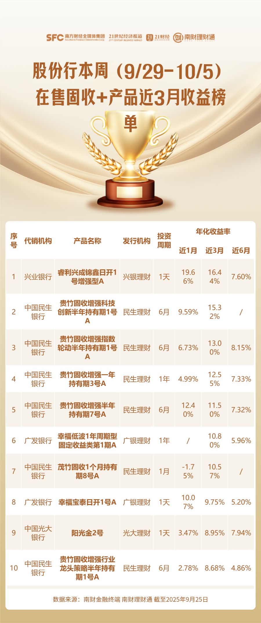 银行渠道本周在售“固收+”理财产品榜单(9/29-10/5)