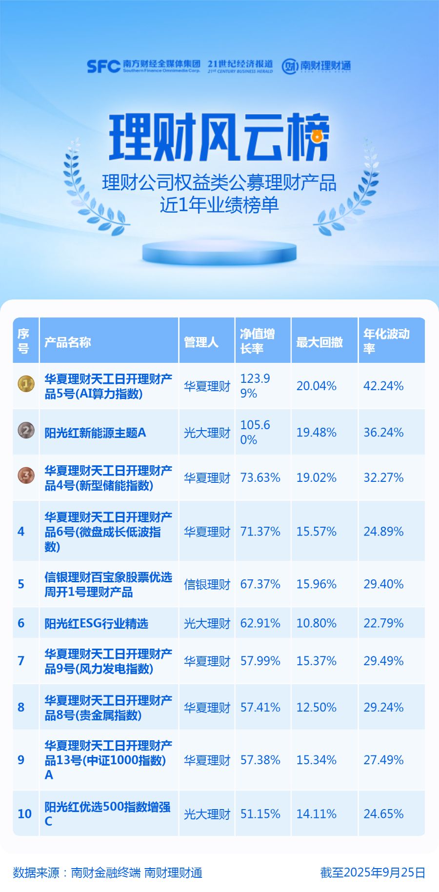 产品统计范围为理财公司发行的公募权益类产品,统计截止日期为2025年9月25日,统计区间为近1年。