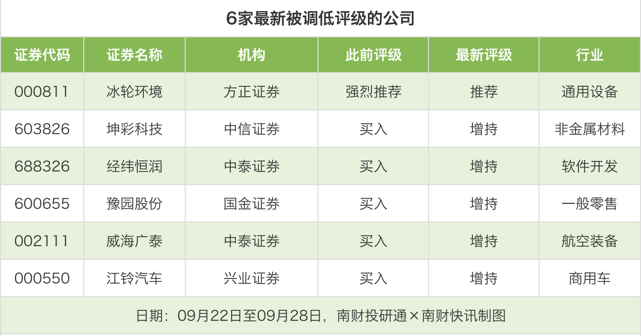 评级调低方面,9月22日至9月28日,券商调低上市公司评级达到6家次,最新数据包括了方正证券对冰轮环境的评级从“强烈推荐”调低至“推荐”,中信证券对坤彩科技的评级从“买入”调低至“增持”,中泰证券对经纬恒润的评级从“买入”调低至“增持”。