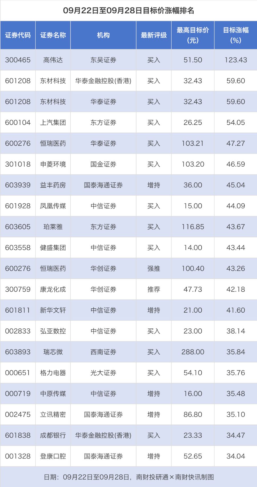 南财投研通数据显示,9月22日至9月28日,券商给予上市公司目标价共116次,按最新收盘价计算,目标价涨幅排名居前的公司有高伟达、东材科技、上汽集团,目标价涨幅分别为123.43%、59.60%、54.05%,分别属于软件开发、塑料、乘用车行业。