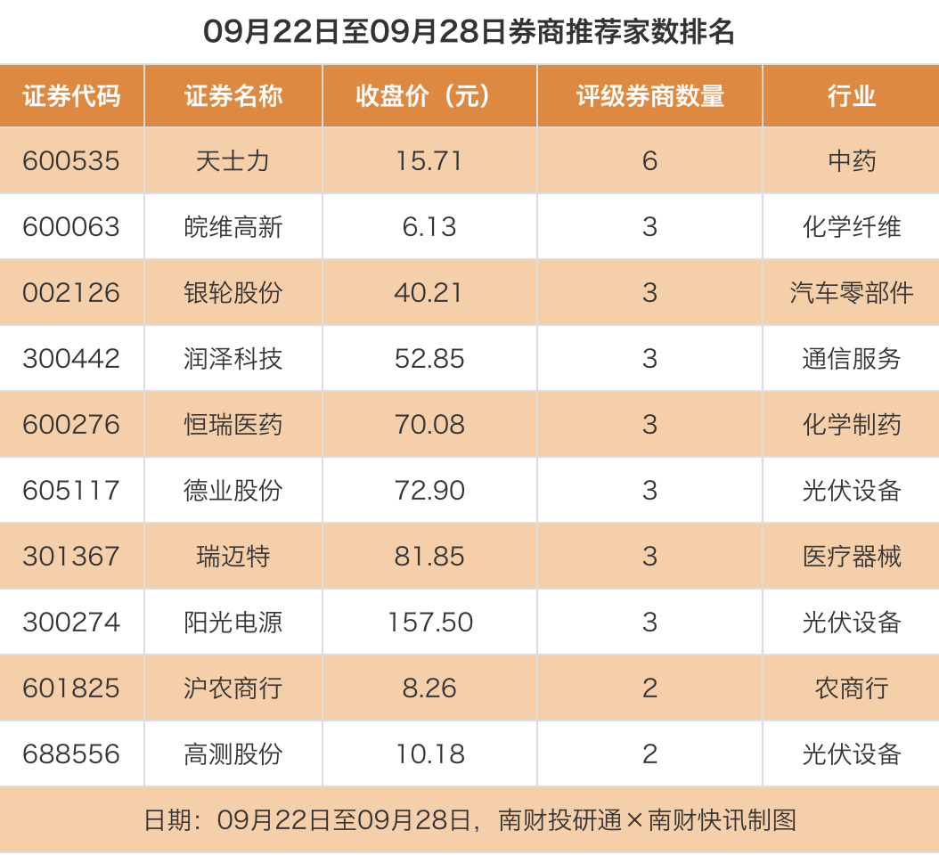 从券商推荐家数来看,9月22日至9月28日有366家上市公司得到券商推荐,其中天士力获得6家推荐,皖维高新获得3家推荐,银轮股份获得3家推荐。