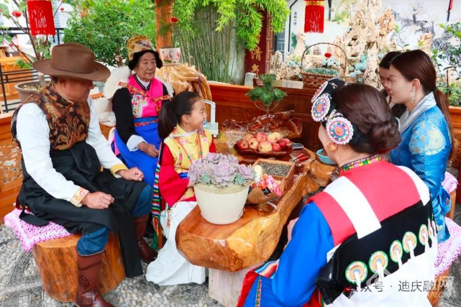 以汉族长衫为底,其间点缀着傈僳族与白族的传统纹样,披肩是纳西族特色的“披星戴月”——这件融合了多民族文化元素的礼服,正是迪庆藏族自治州香格里拉市建塘镇金龙社区多民族交融共生的生动缩影。在这里,藏族、纳西族、彝族、傈僳族、白族、回族、汉族等多民族群众共居共学、共建共享、共事共乐。