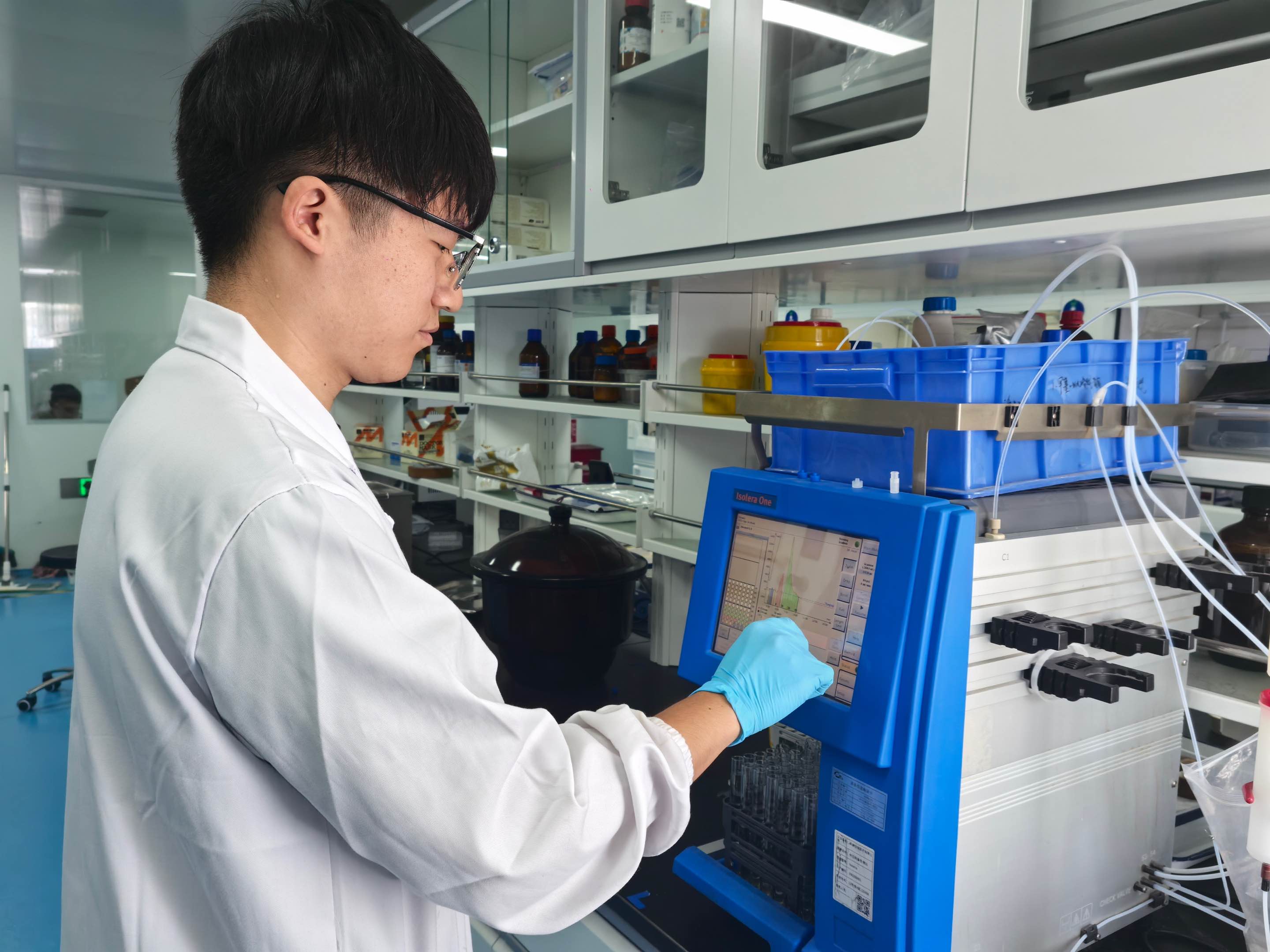 在天津恒瑞医药有限公司实验室里,天津大学药学院和恒瑞医药校企共育的硕士研究生张德兆正分离纯化药物分子,用于新一代精准诊疗抗癌靶向药物的研究。