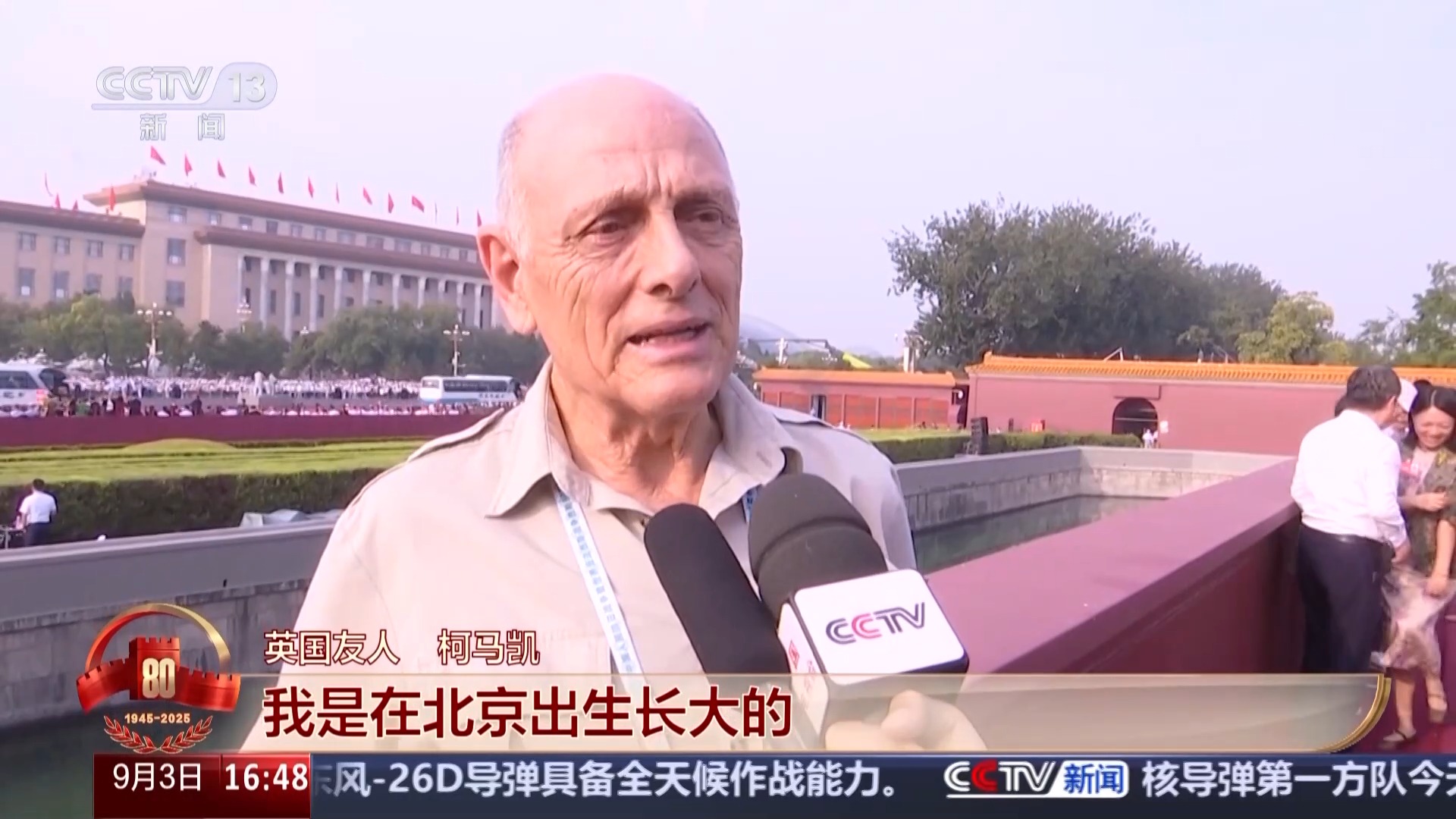 英国友人 柯马凯:我是在北京出生长大的,我多次到天安门广场参加各种活动。中国在国际上发挥的作用是帮助追求和平、阻止战争,我觉得不像有些国家见了战争就得站队,而中国是去参与调停。和平发展是人民群众最需要的。