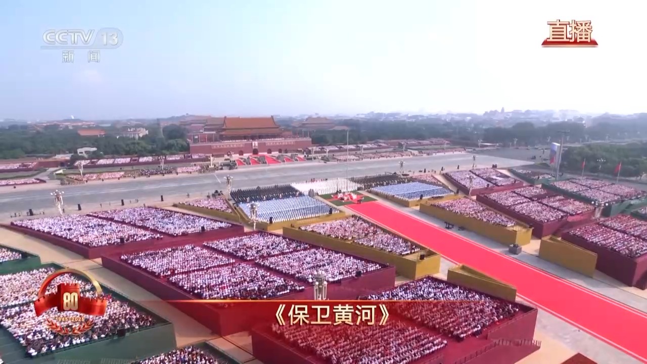 纪念大会开始前,天安门广场上千人军乐团、合唱团奏唱抗战歌曲《保卫黄河》。