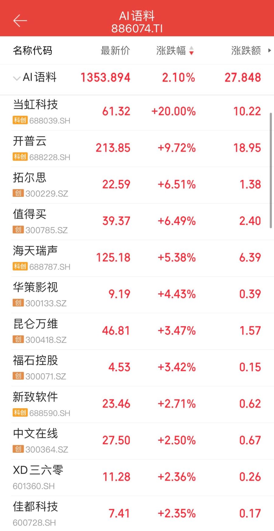 9月30日早盘,AI相关概念股集体拉升。AI语料方向,当虹科技20CM涨停,开普云、拓尔思、值得买等涨超5%;半导体硬件方向,德明利涨停,江波龙、联芸科技等涨超5%,寒武纪、东芯股份等跟涨。