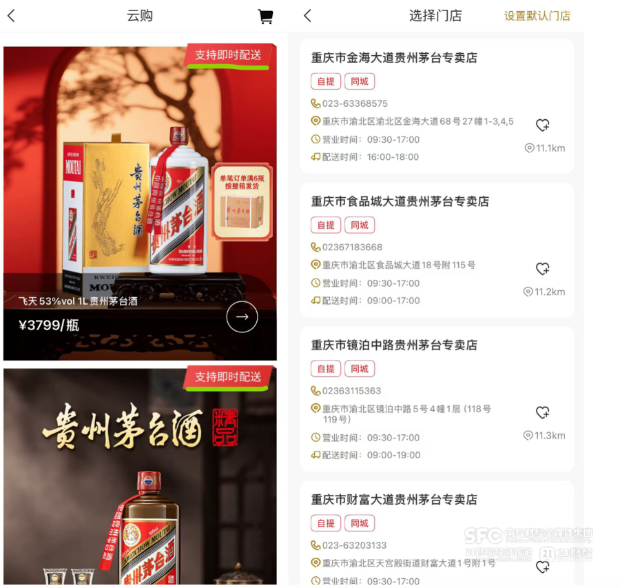 9月30日开始,i茅台APP推出了“即时配送”服务。上午9点,21世纪经济报道记者进入i茅台“云购”页面看到,公斤茅台、精品茅台均已显示“支持即时配送”。