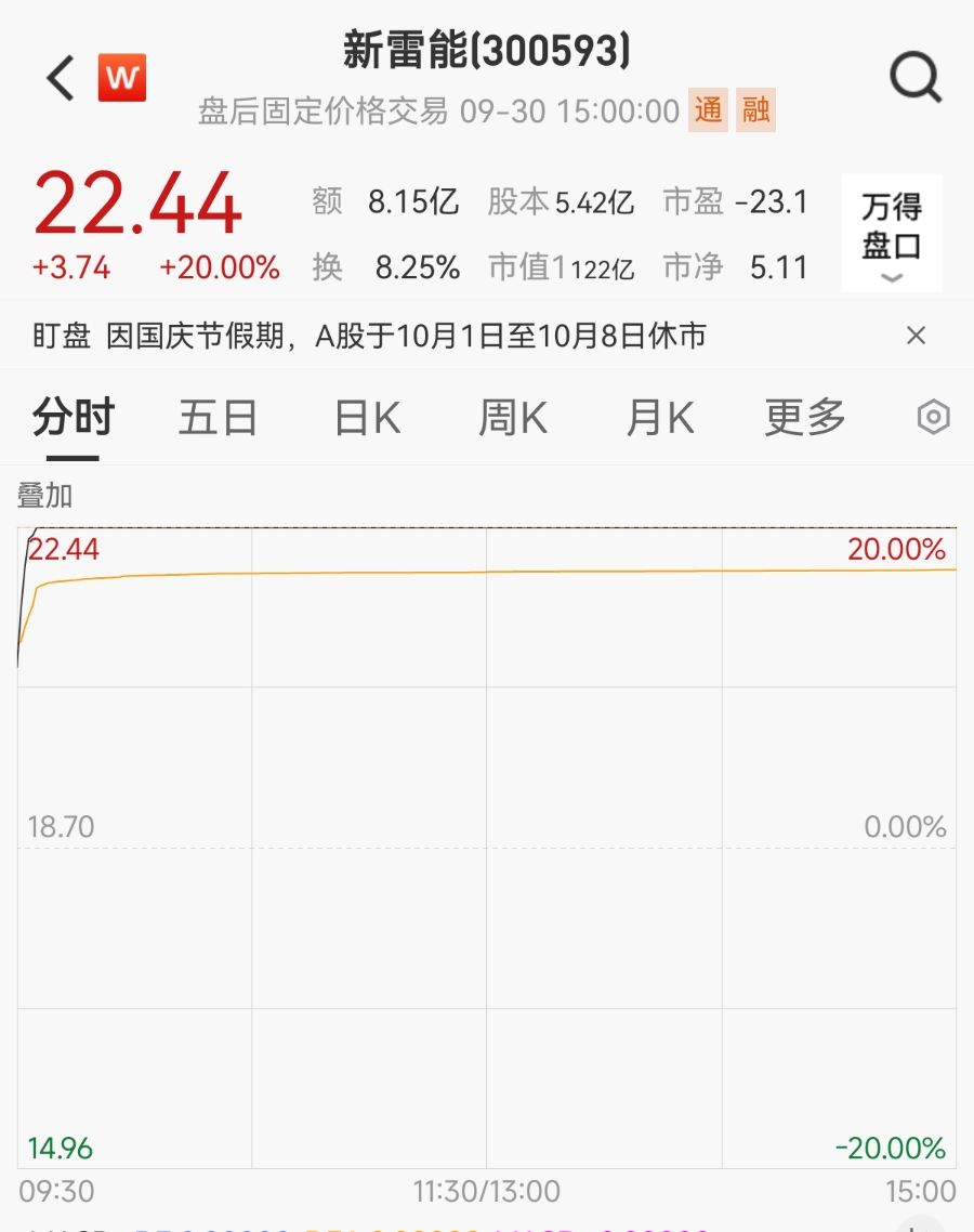 9月30日,特种电源龙头新雷能(300593.SZ)20CM涨停封板,收盘报22.44元/股,市值122亿元。