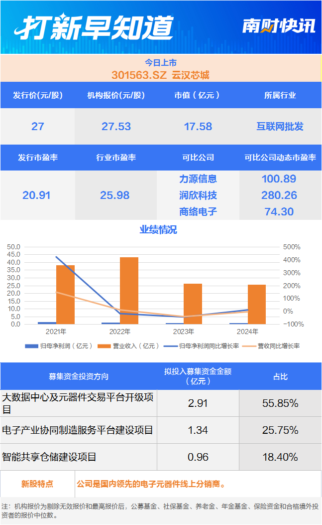 招股书显示,公司通过有效运用数字技术和互联网技术,基于自建自营的云汉芯城B2B线上商城,主要为电子制造产业提供高效、专业的电子元器件供应链一站式服务,并延伸至产品技术方案设计、PCBA生产制造服务、电子工程师技术支持等多个领域,公司下属子公司深圳汉云拥有CNAS认证的电子元器件检测实验室。该公司本次募集资金主要投向大数据中心及元器件交易平台升级项目、电子产业协同制造服务平台建设项目和智能共享仓储建设项目。