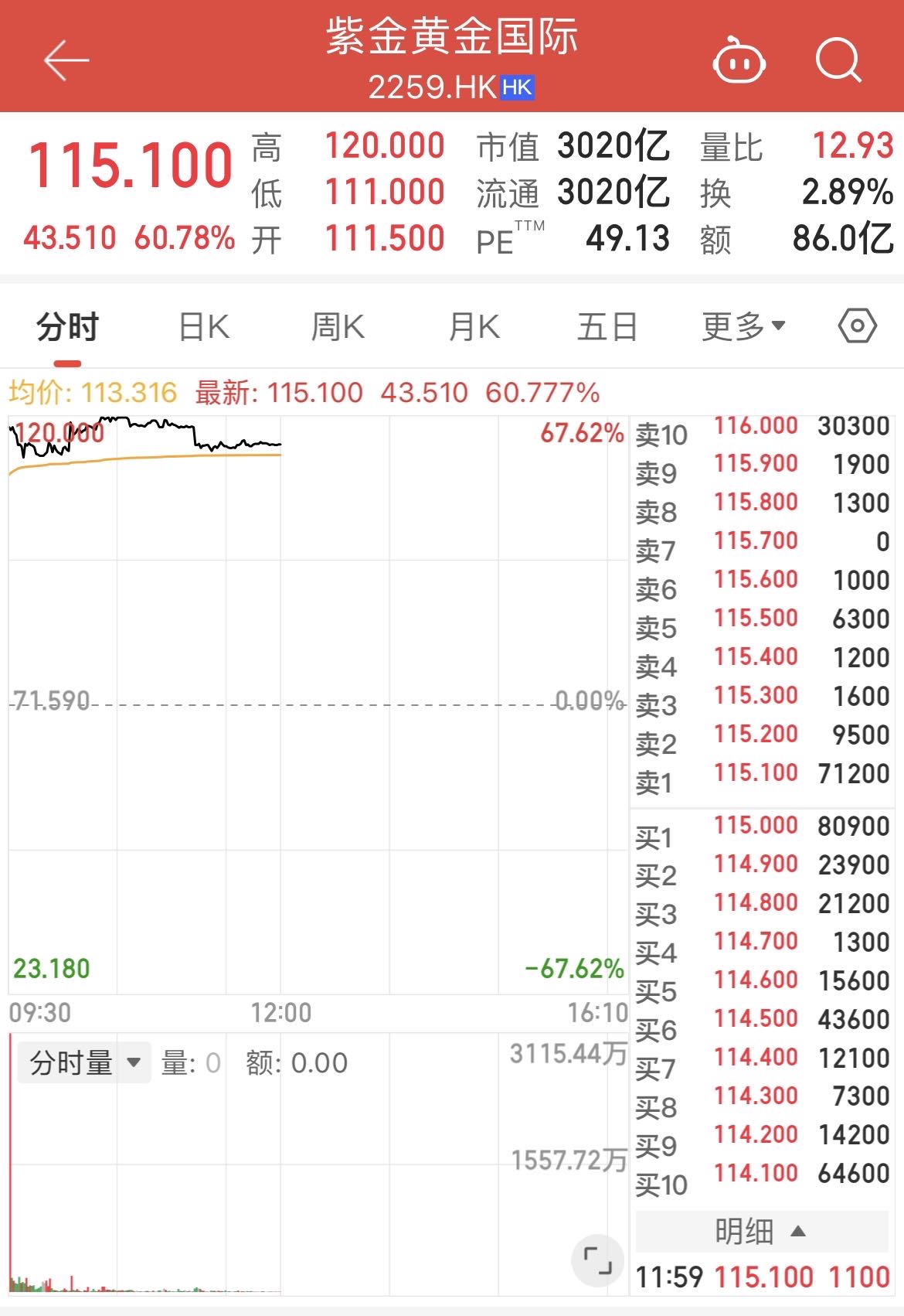 9月30日,紫金矿业(601899.SH)旗下紫金黄金国际(02259.HK)正式登陆港交所,股价开盘即报111.5港元/股,较发行价71.59港元/股上涨55.75%。截至午盘,涨幅扩大至60.78%,报115.1港元/股,总市值达到3020亿港元。