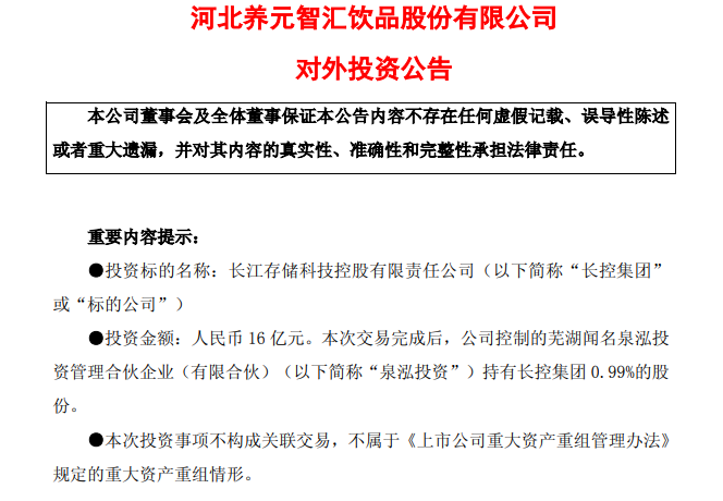 一家河北饮料公司,跨界入股存储龙头。